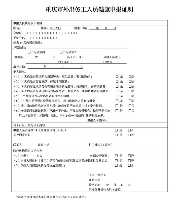 秀山网讯 2月19日,记者从有关单位获悉,即日起,我县将为外出务工人员提供免费健康申报证明服务,至新冠肺炎疫情解除为止。据了解,所有在秀山居住 14 天以上、且接受当地村( 社区) 管理的有外出务工需要的人员,到居住地村( 社区) 领取并如实填报市卫生健康委印制的《 …