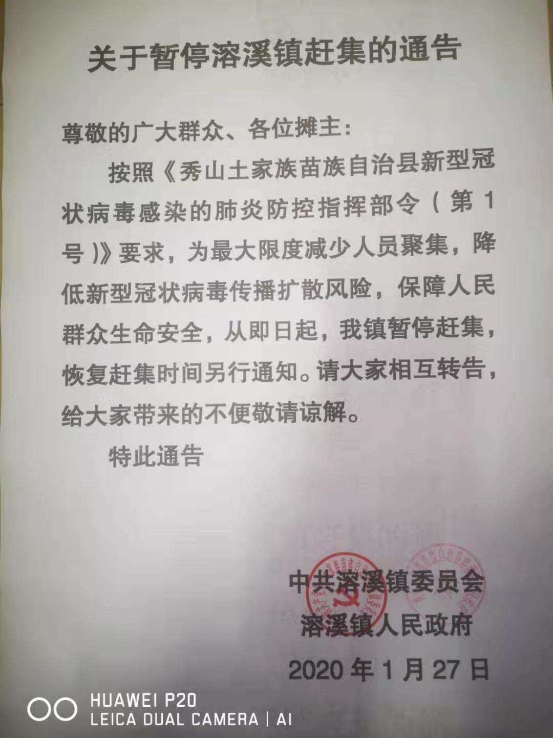 秀山网讯 为减少人员流动,降低新型冠状病毒传播扩散风险,做好新型冠状病毒感染的肺炎疫情防控工作,切实保障人民群众身体健康和生命安全,秀山各乡镇按下赶集日“暂停键”。 (全媒体记者 杨丽华)