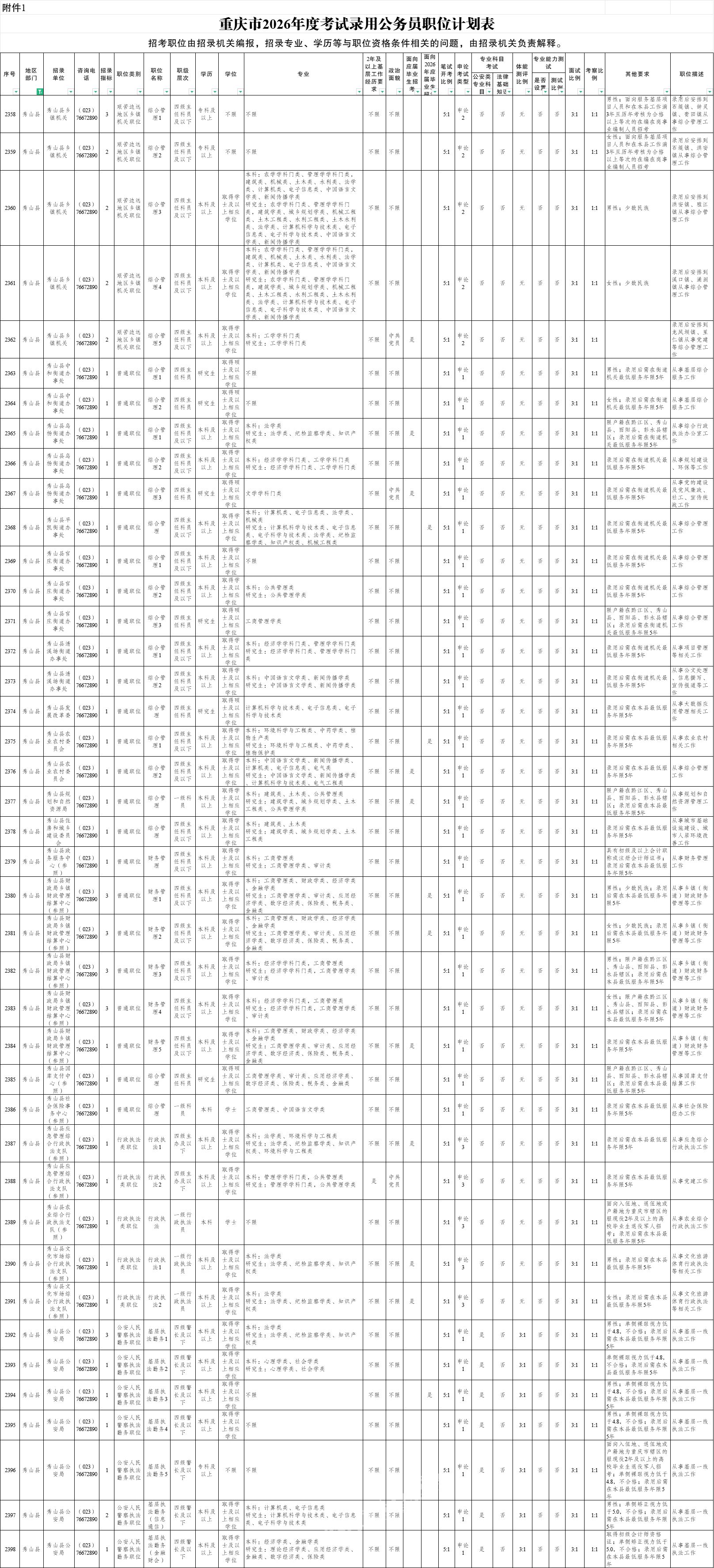秀山网讯 日前,重庆市人力资源和社会保障局发布2026年度公开考试录用公务员公告,全市各级机关计划招考公务员4150名。其中,秀山县发展改革委、秀山县农业农村委员会、秀山县公安局等单位部门将招录公务员58名。