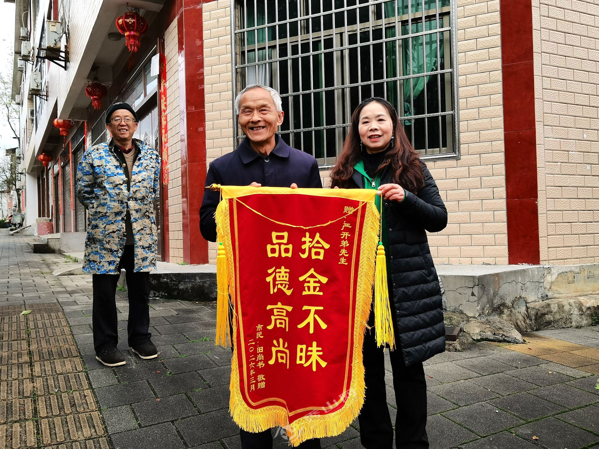 为表达诚挚谢意,3月17日,田尚书老人的女儿特意制作锦旗,送到严开弟老人手中,她激动地表示:“特别感谢老人家,多亏了老人家及时报警并一直帮忙跟进。要不是他认真负责、拾金不昧,这笔钱肯定找不回来了。”
