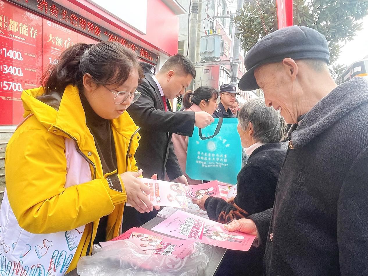 活动现场,各部门立足职能、协同发力,精准对接群众急难愁盼需求,围绕“重庆婚姻幸福热线”推广、科学婚恋引导、反家暴维权、反诈防骗、婚姻家庭法治普及等内容开展宣传服务,让群众在赶场采购之余,便捷享受专业服务、提升法治素养。活动通过闯关打卡、资料发放、现场宣讲、视频播放等群众喜闻乐见的形式,有效提升群众参与度和宣传传播力,整场活动累计发放宣传资料1000余份。