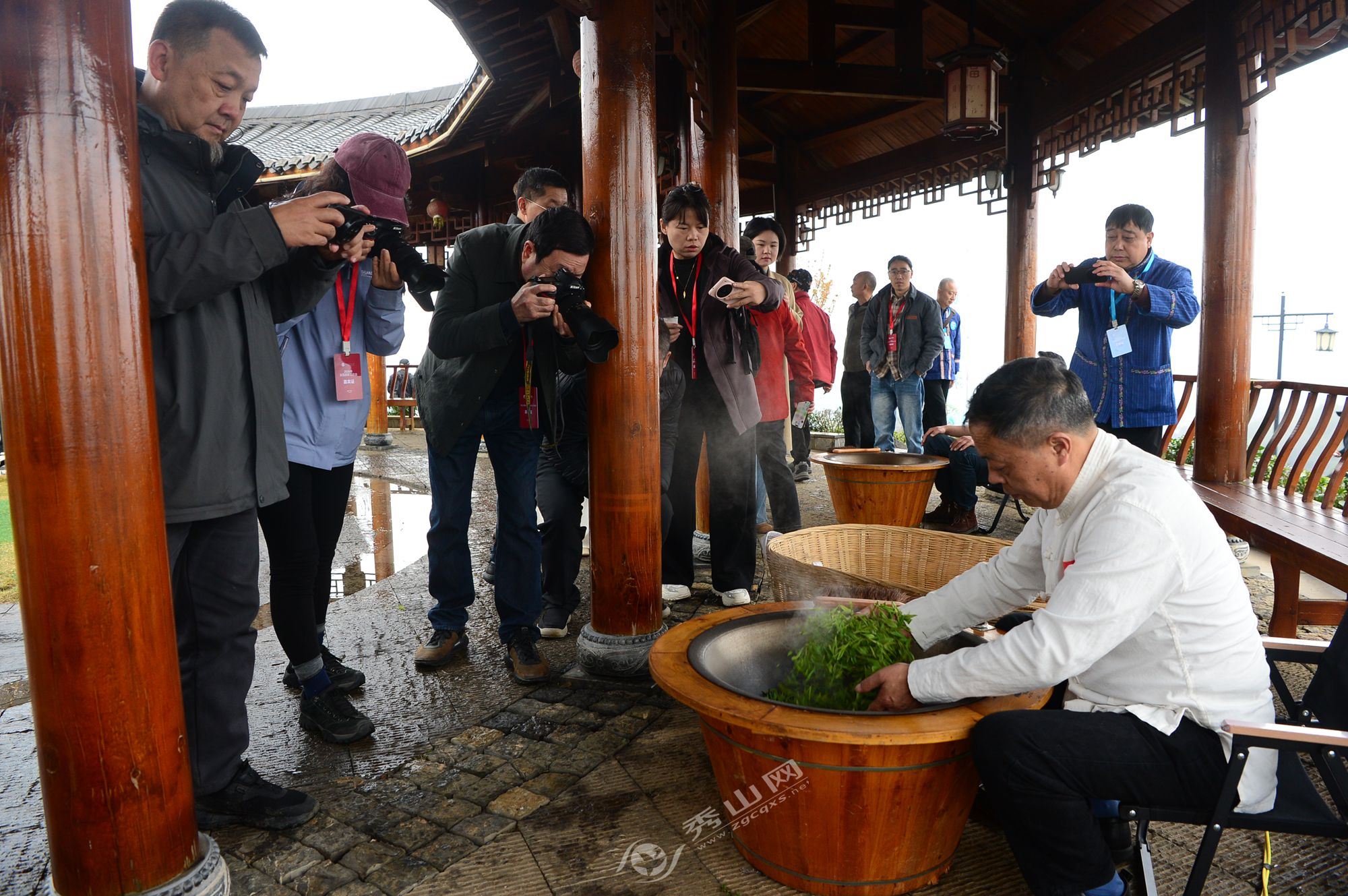 在梅江镇兴隆坳樱花茶园,春日的樱花竞相绽放,与层层叠叠的茶园相映成趣,形成了樱茶共生的独特景致。摄影家们穿梭在葱郁的茶林间,将镜头聚焦于忙碌劳作的采茶人,完整记录下茶叶采摘、晾晒、加工制作的全流程,同时与当地茶农亲切交流,详细询问茶叶种植技术、产业规模、市场销售等情况,深入了解秀山茶产业从培育到发展的完整历程,用影像记录秀山依托生态资源发展特色农业,将小小绿叶变成带动群众增收致富“金叶”、以茶产业赋能乡村振兴的生动实践。同为武陵山区的湖北恩施摄影家协会主席张洪刚对此感触颇深,樱花与茶园相伴的景观让人眼前一亮,花香与茶香交织的氛围尽显春和景明的美好,秀山与恩施地缘相近、山水相连、民族文化相通,置身秀山的山水之间,有着如同归家一般的亲切感。