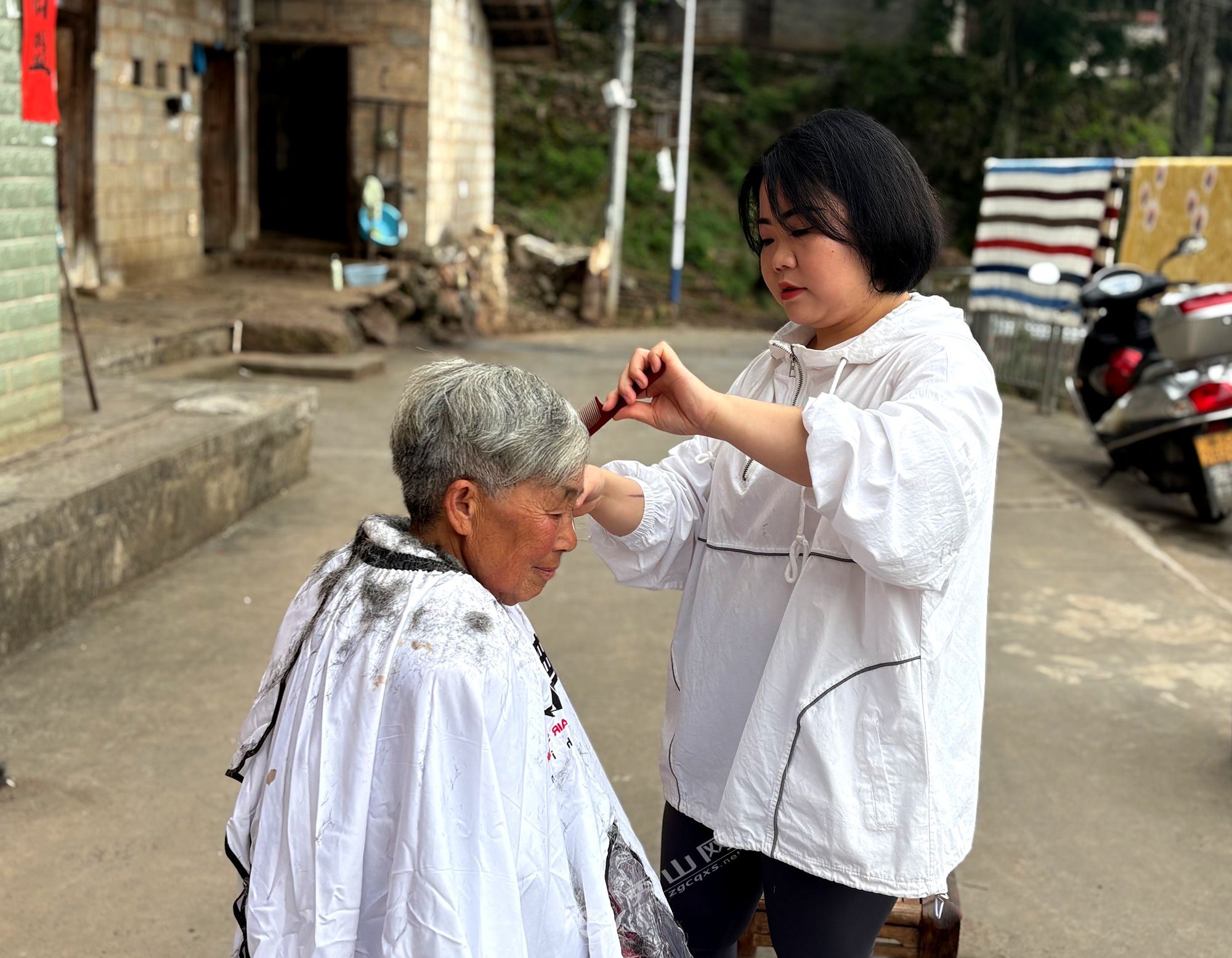 面对草果村部分高龄、留守老人因行动不便而面临的“理发难”问题,许珊珊主动担当,将村民的院坝变为自己的“工作台”,用爱心搭建起了一座座移动的“理发间”。