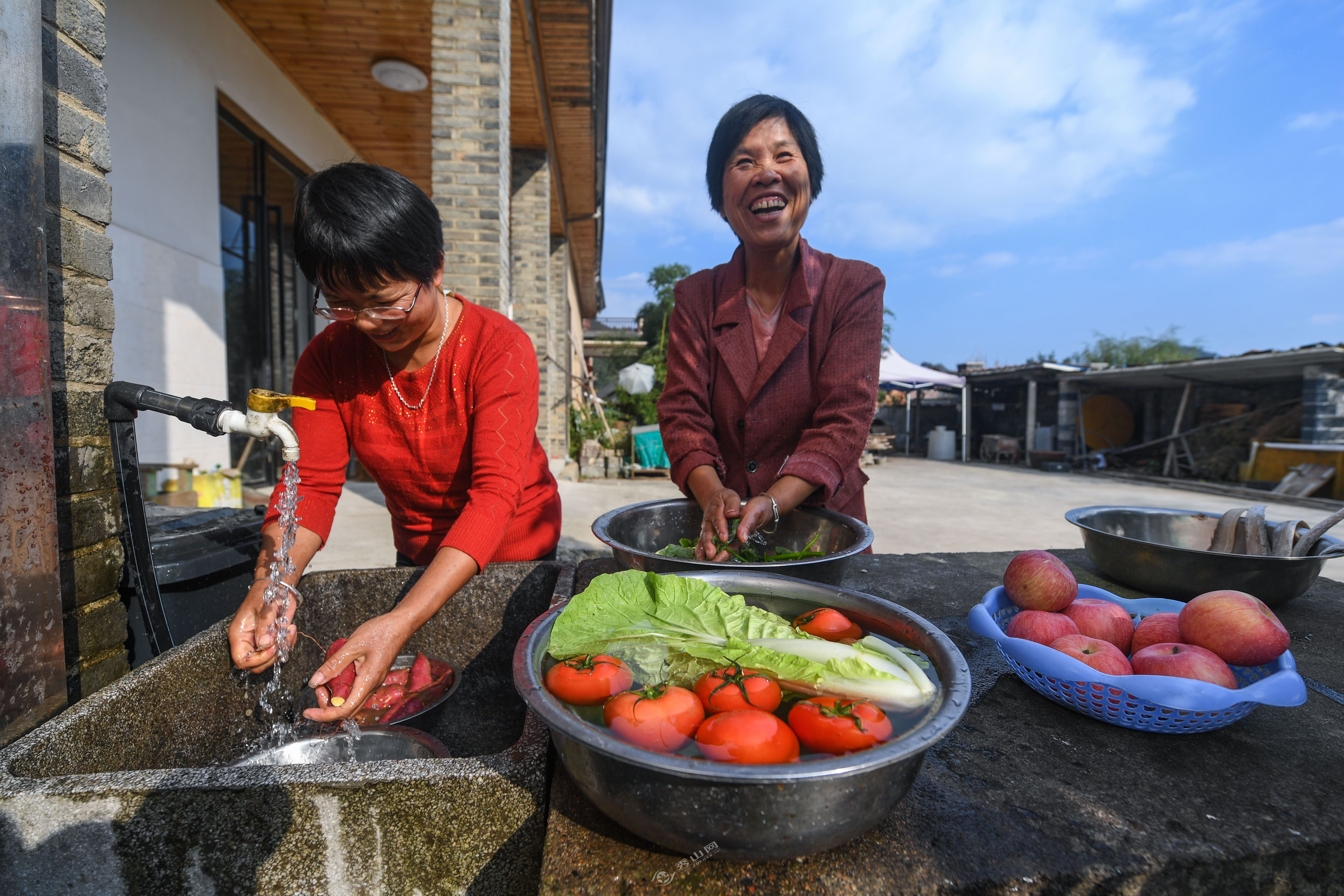 村民在自家院坝洗菜、洗衣服。秀山县委宣传部供图