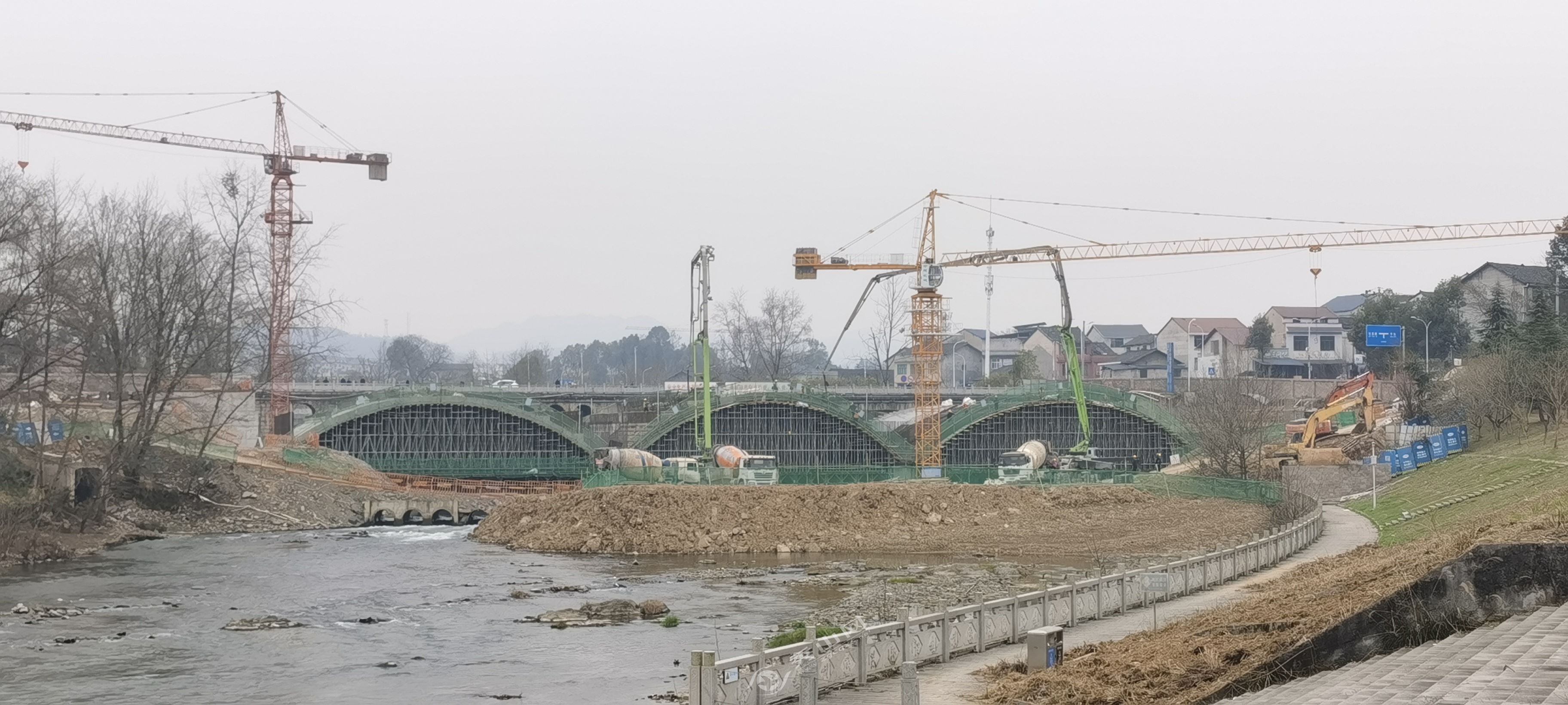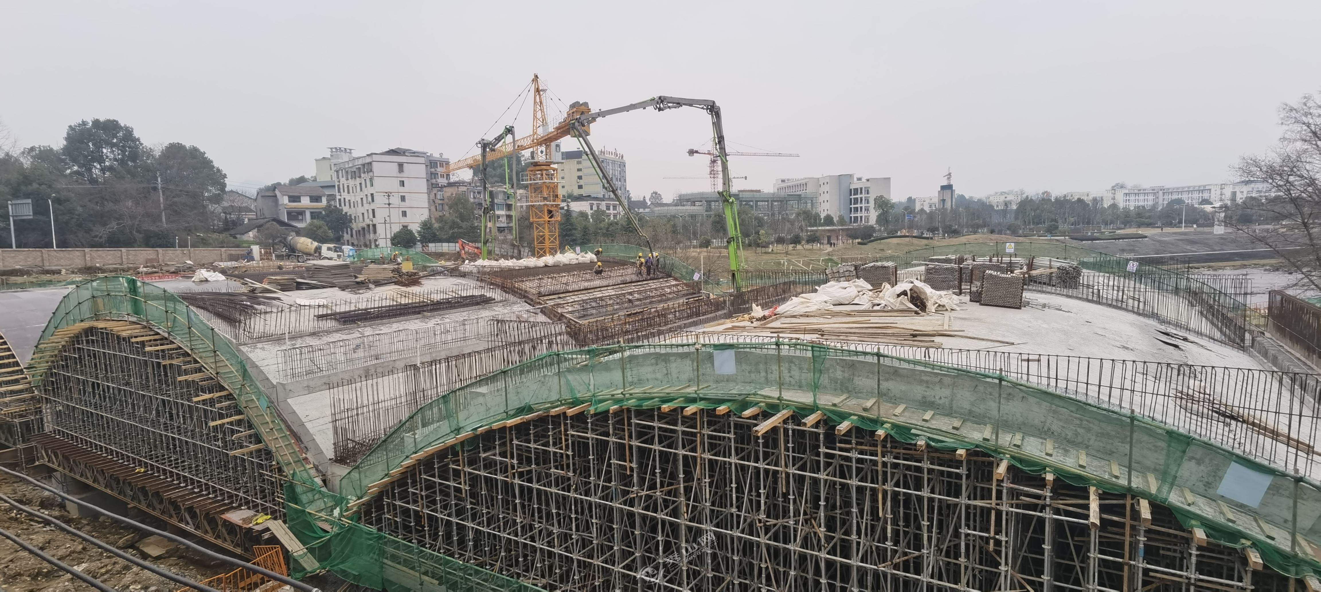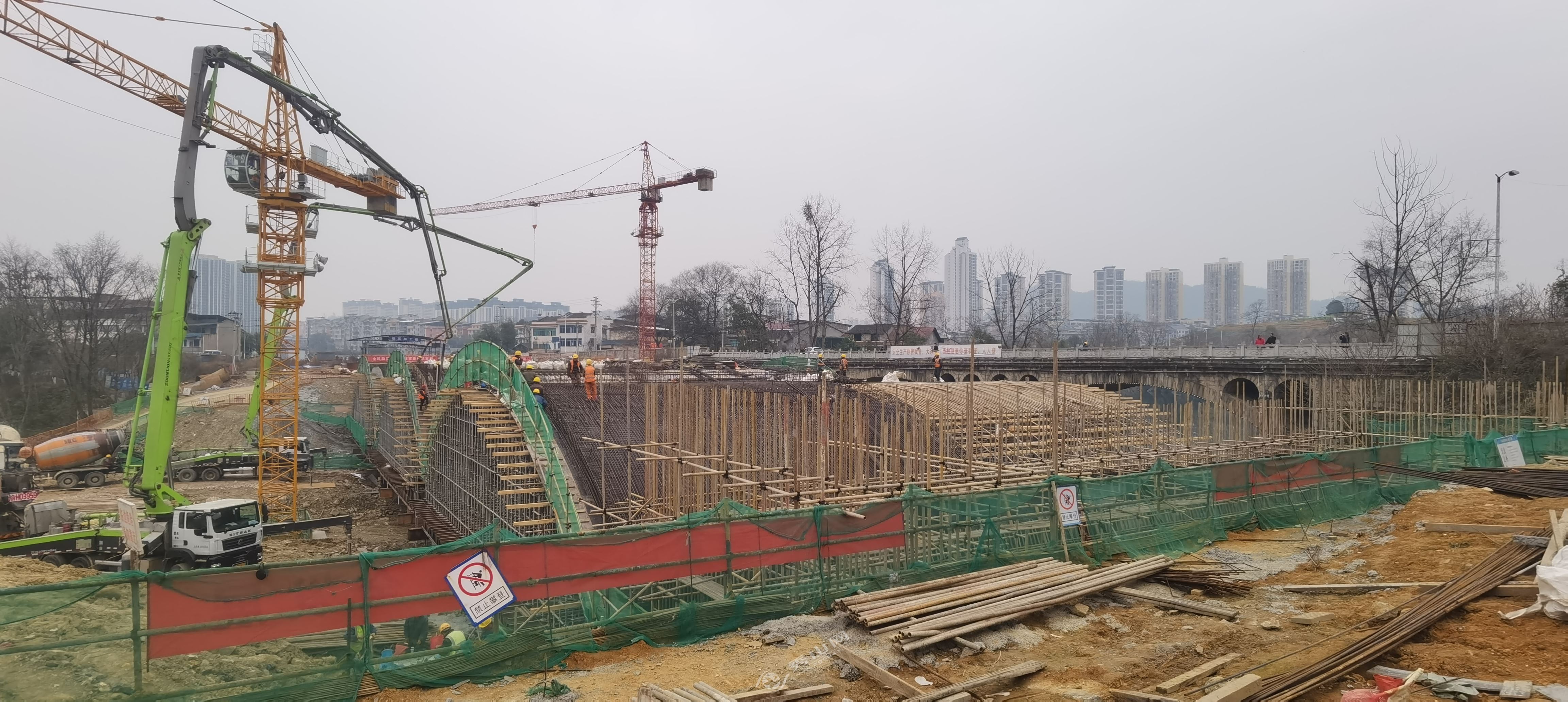 秀山网讯 黄杨大道(石莲路至牛市井段)桥梁工程是该路段的控制性工程,目前正加快桥拱浇筑施工。3月3日,记者在黄杨大道(石莲路至牛市井段)桥梁工程施工现场看到,施工方正抢抓有利时机,抓紧进行桥梁桥拱浇筑施工。目前,桥拱桁架搭建已施工完毕,已完成一座桥拱和一座桥台浇筑施工,剩下的两座桥拱和一座桥台浇筑施工正有序推进。黄杨大道(石莲路至牛市井段)桥梁工程设计全长110米,桥梁宽32米,为上承式钢筋混凝土拱桥。