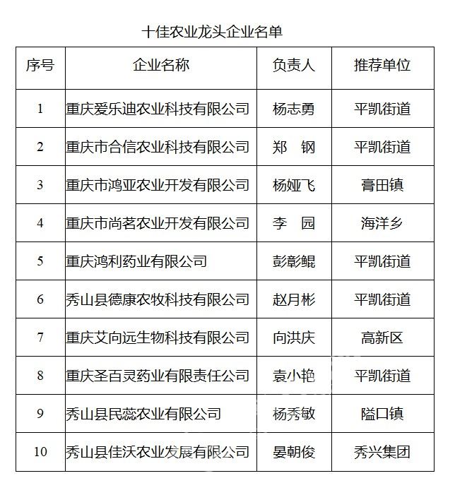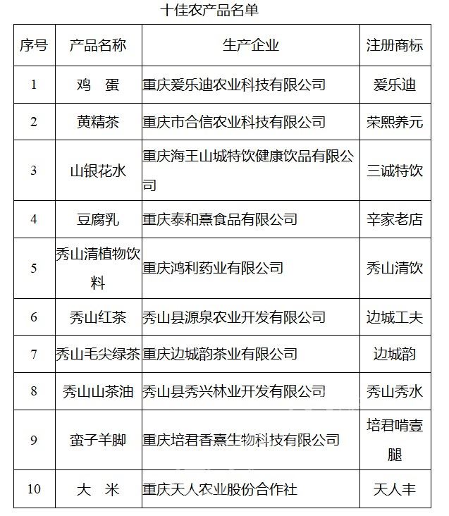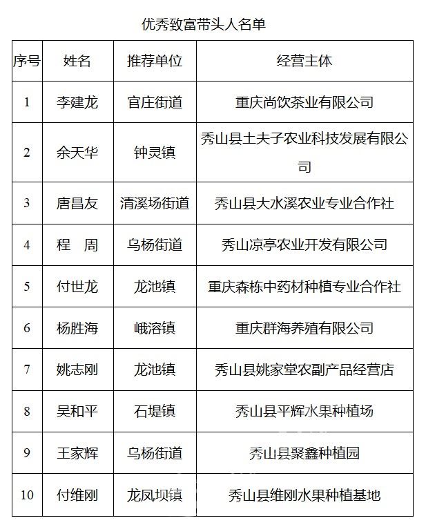 秀山网讯 为表扬先进、鼓舞干劲,激励全县广大干部群众在新时代“三农”工作中锐意进取、再创佳绩,在第八个“中国农民丰收节”到来之际,经县委农村工作暨实施乡村振兴战略领导小组研究,决定对李建龙等10名优秀致富带头人、重庆爱乐迪农业科技有限公司等十佳农业龙头企业、黄精茶等十佳农产品予以通报表扬。