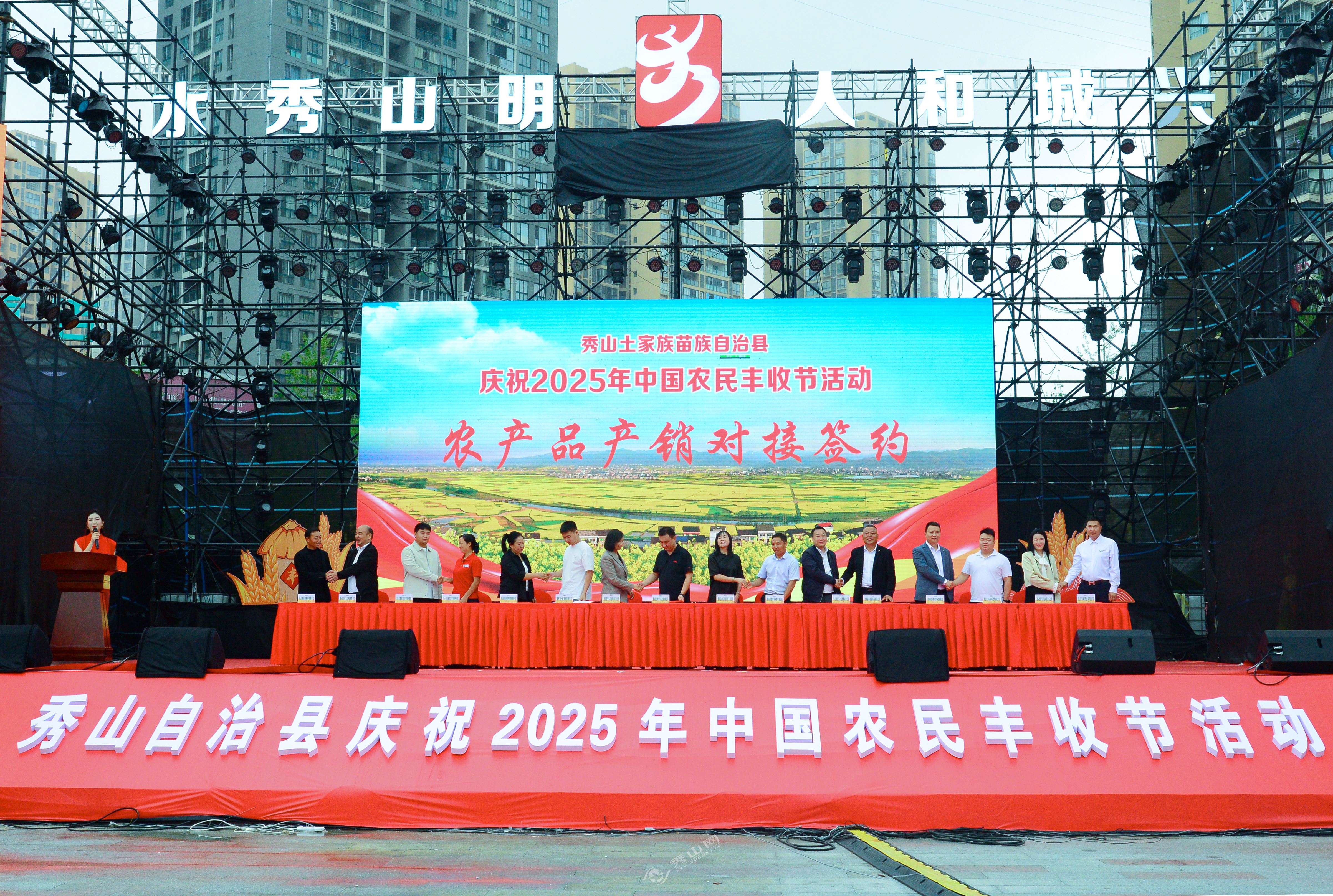 好产品需有好舞台,农产品推介环节亮点纷呈。5位产品推介人依次登场,推介秀山清植物饮料、鸡蛋、秀山山茶油、秀山红茶、大米等多款“秀山爆品”。活动还举行了农产品产销对接签约仪式,8对供需方达成合作,签约总金额超1亿元,涵盖山银花、茶叶、柑橘、鸡蛋、干辣椒、豇豆、蔬菜等多个品类,为秀山优质农产品打通了走向大市场的“快车道”。