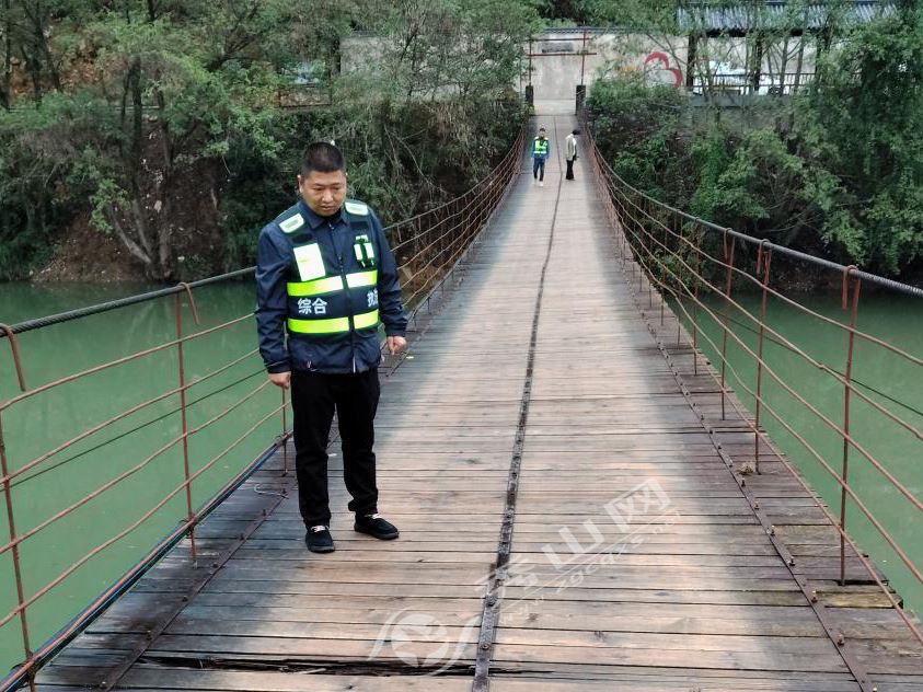 检查组先后前往鱼梁村吊桥、沿河码头,重点检查设施结构稳固性、安全警示标识设置、应急防护措施配备情况,并现场测试防护栏承重性能,对发现的1处桥面木块缺失问题要求立即整改。