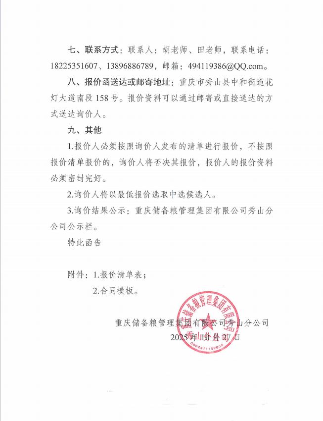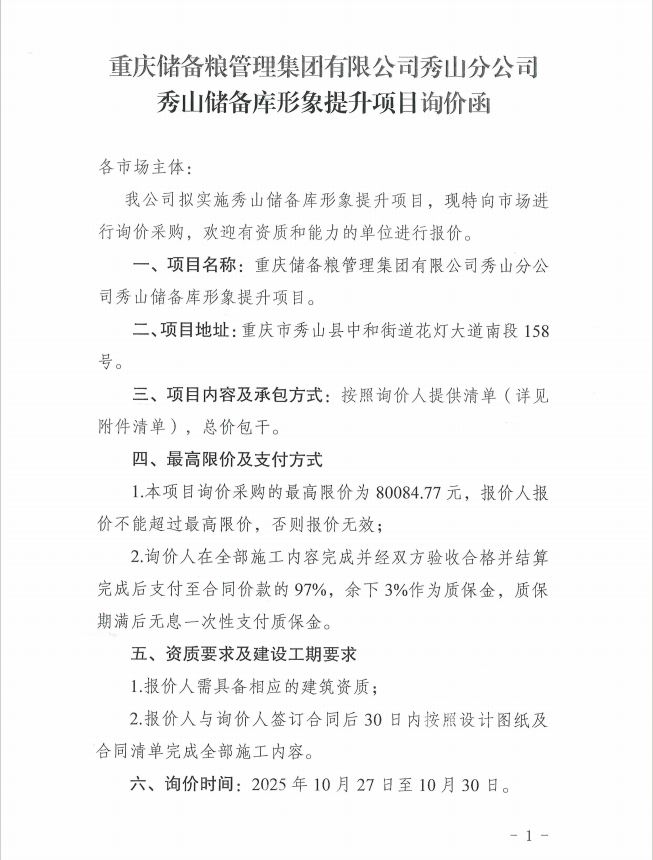 重庆储备粮管理集团有限公司秀山分公司秀山储备库形象提升项目询价函