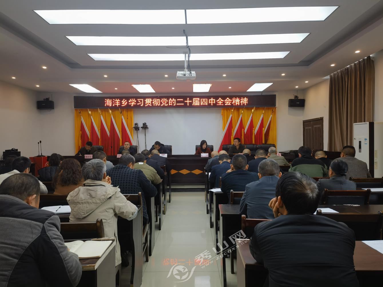 秀山网讯 近日,海洋乡召开专题学习会议,集中传达学习贯彻党的二十届四中全会精神。该乡全体乡干部职工及各村三职干部、驻村全体队员60余人参加会议。
