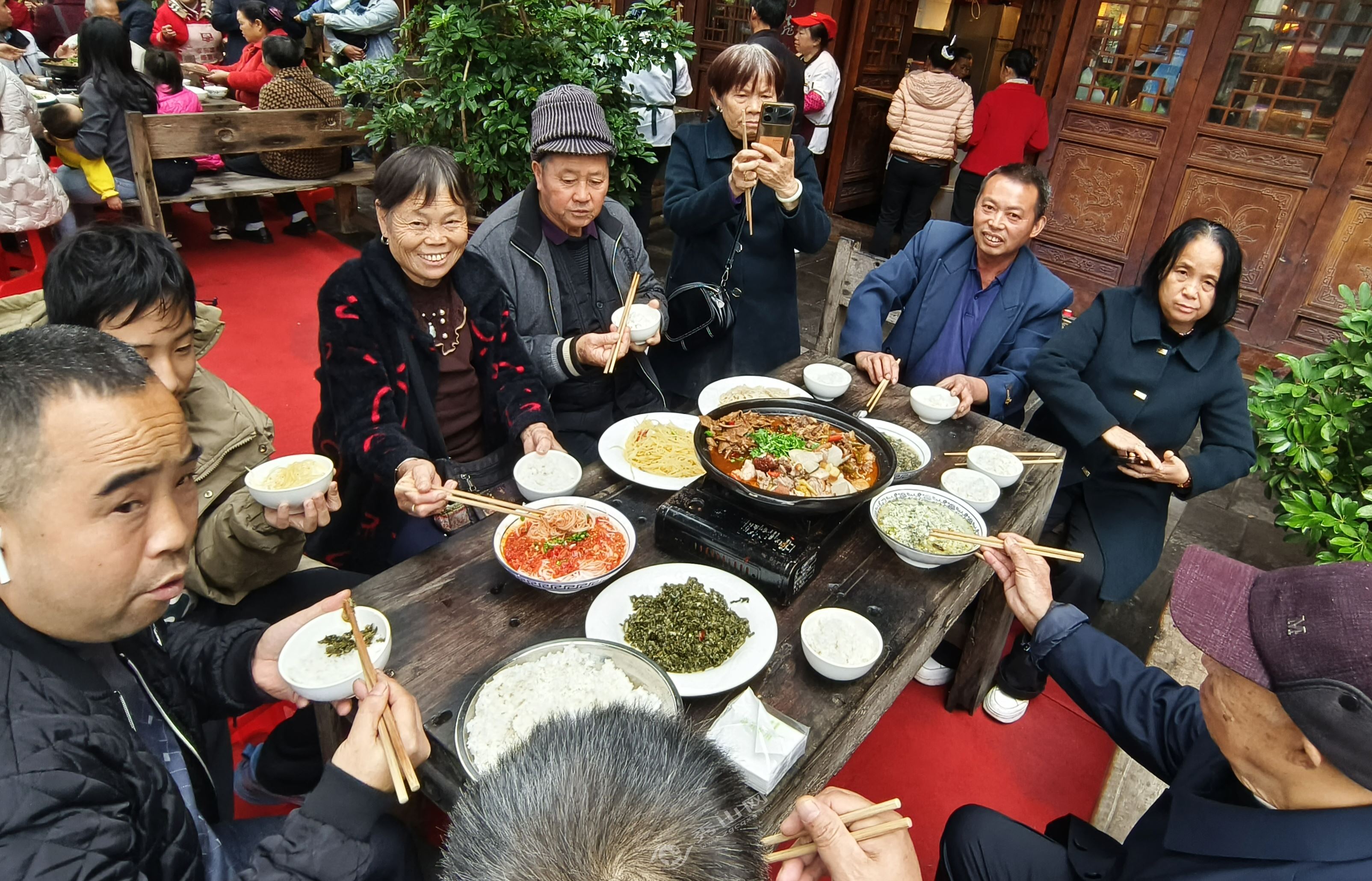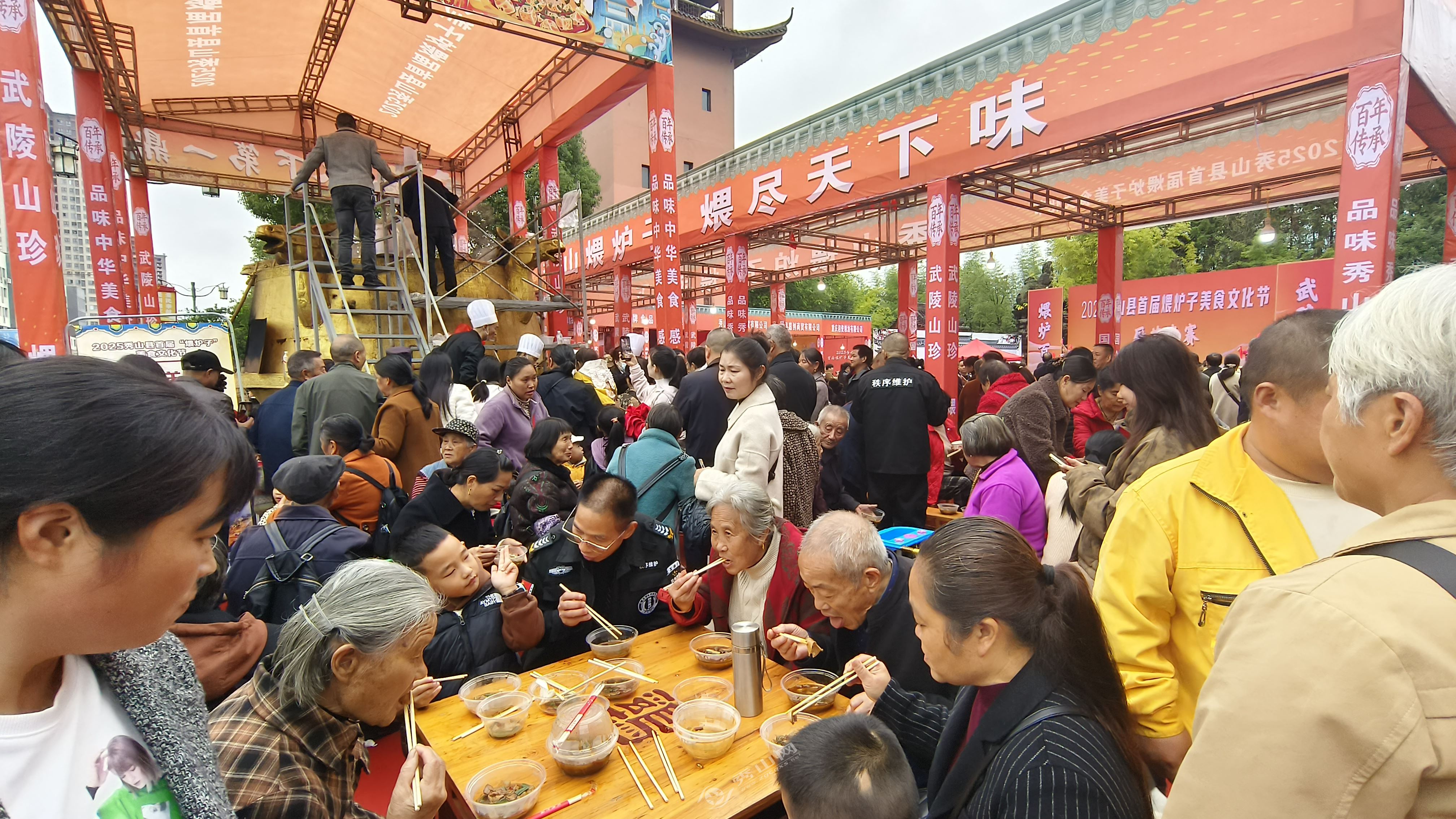 活动现场热闹非凡,用餐景象热火朝天。当日,食材展销、大鼎罐煨汤品鉴、长桌宴以及小吃游乐展示等多项活动同步开启,让秀山浓郁的烟火气,成为激活当地文化与产业协同发展的双引擎。