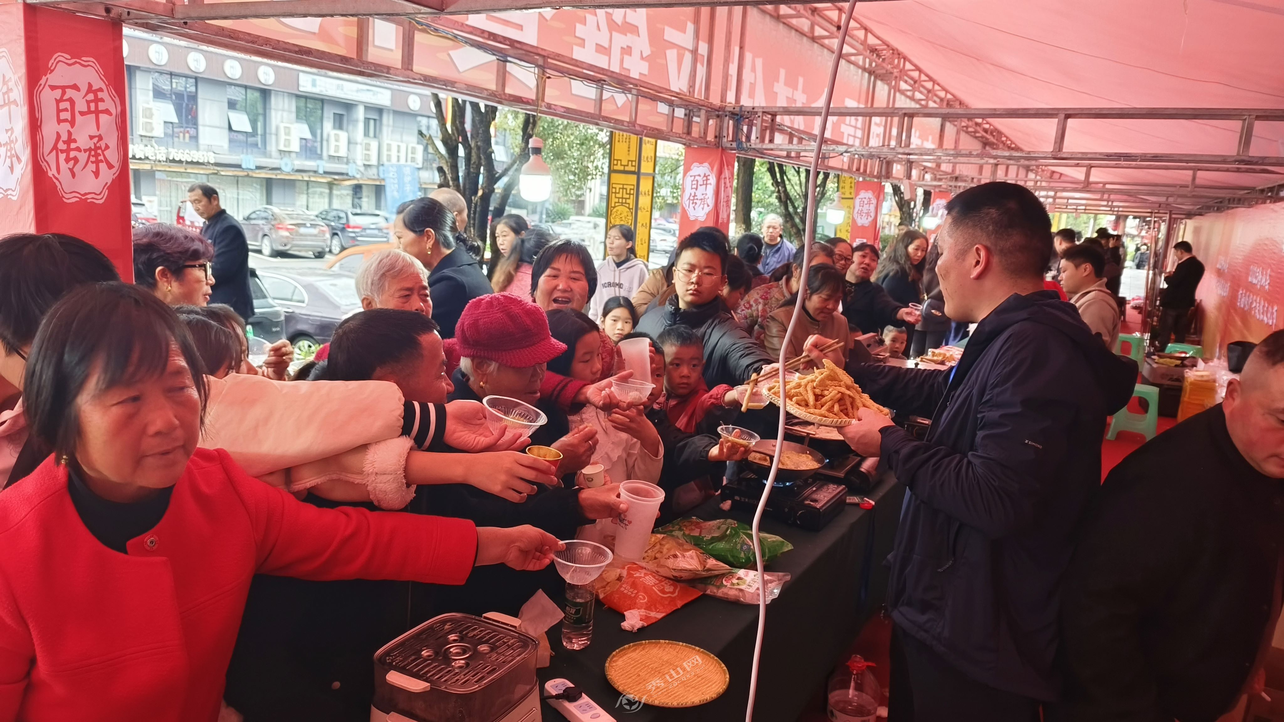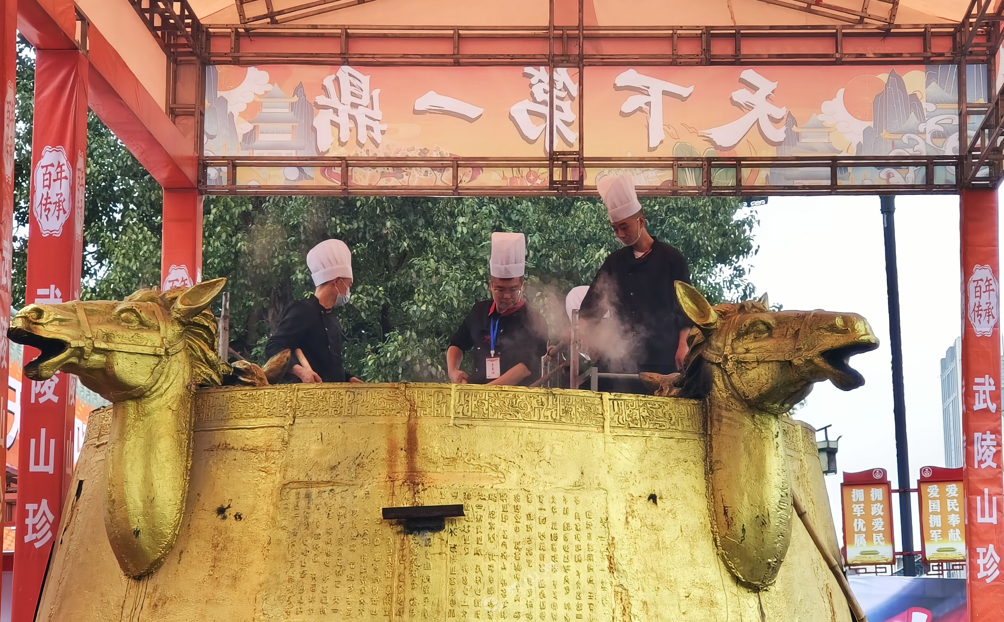 长桌宴一侧,直径4米的大鼎罐持续散发着诱人鲜香,工作人员正忙着为市民游客免费盛汤。煨汤工作人员唐超介绍:“炉子里放了本地猪肚、牛肚、酸辣椒、猪蹄、腊肉等食材,慢火煨了3个小时,大家吃了既暖心又暖胃。”