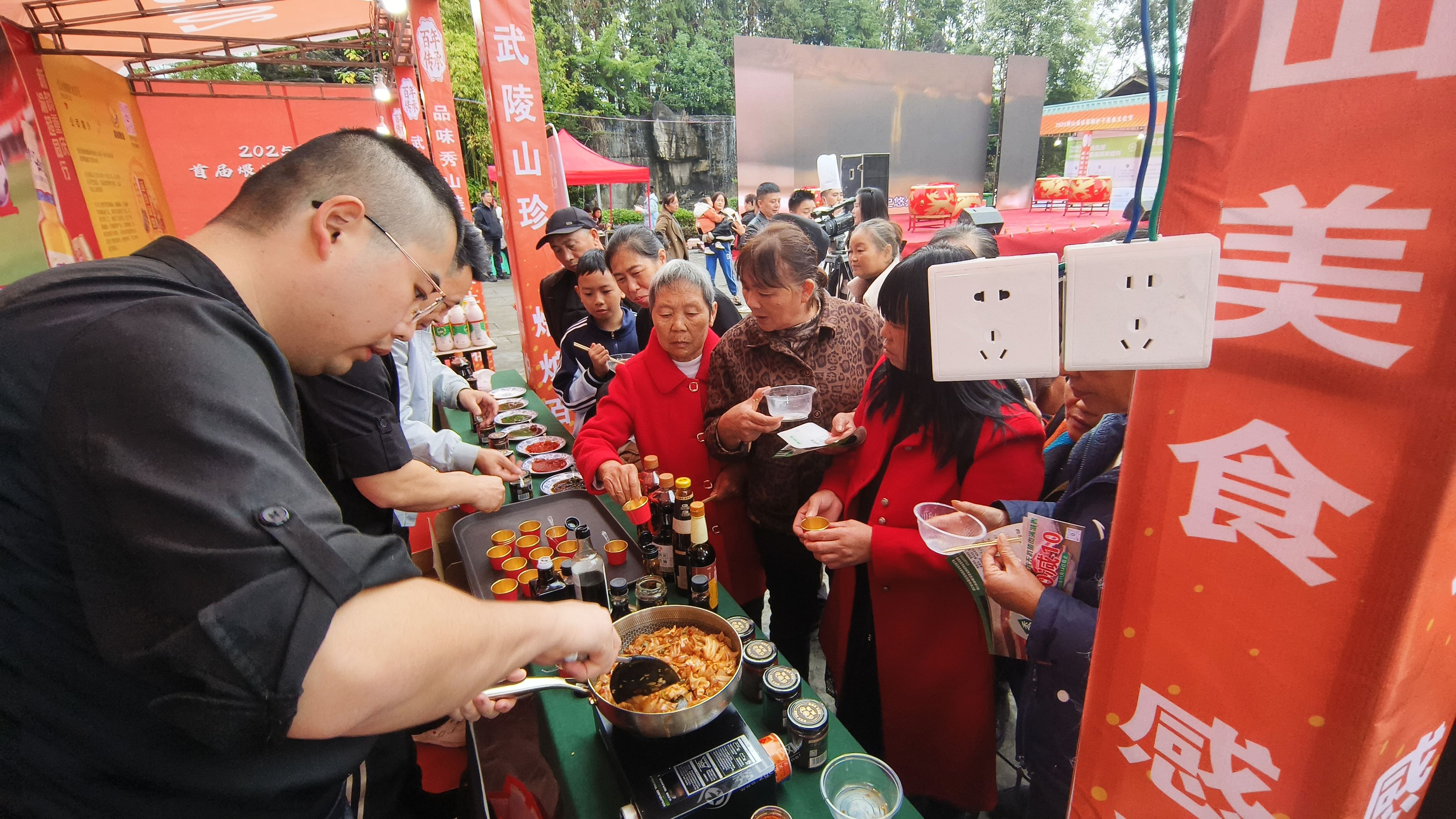 食材展销区率先热闹起来。来自湖南、贵州、重庆等地的各类农特产品整齐码放在展台上,吸引众多游客驻足挑选。湖南湘潭一家拥有285年历史的百年老字号品牌商家负责人冷香表示:“我们带来了龙牌酱油,现场朋友们参与热情很高。非常感谢秀山地方政府提供这次和当地朋友面对面交流的机会,希望有更多机会呈现美味。”