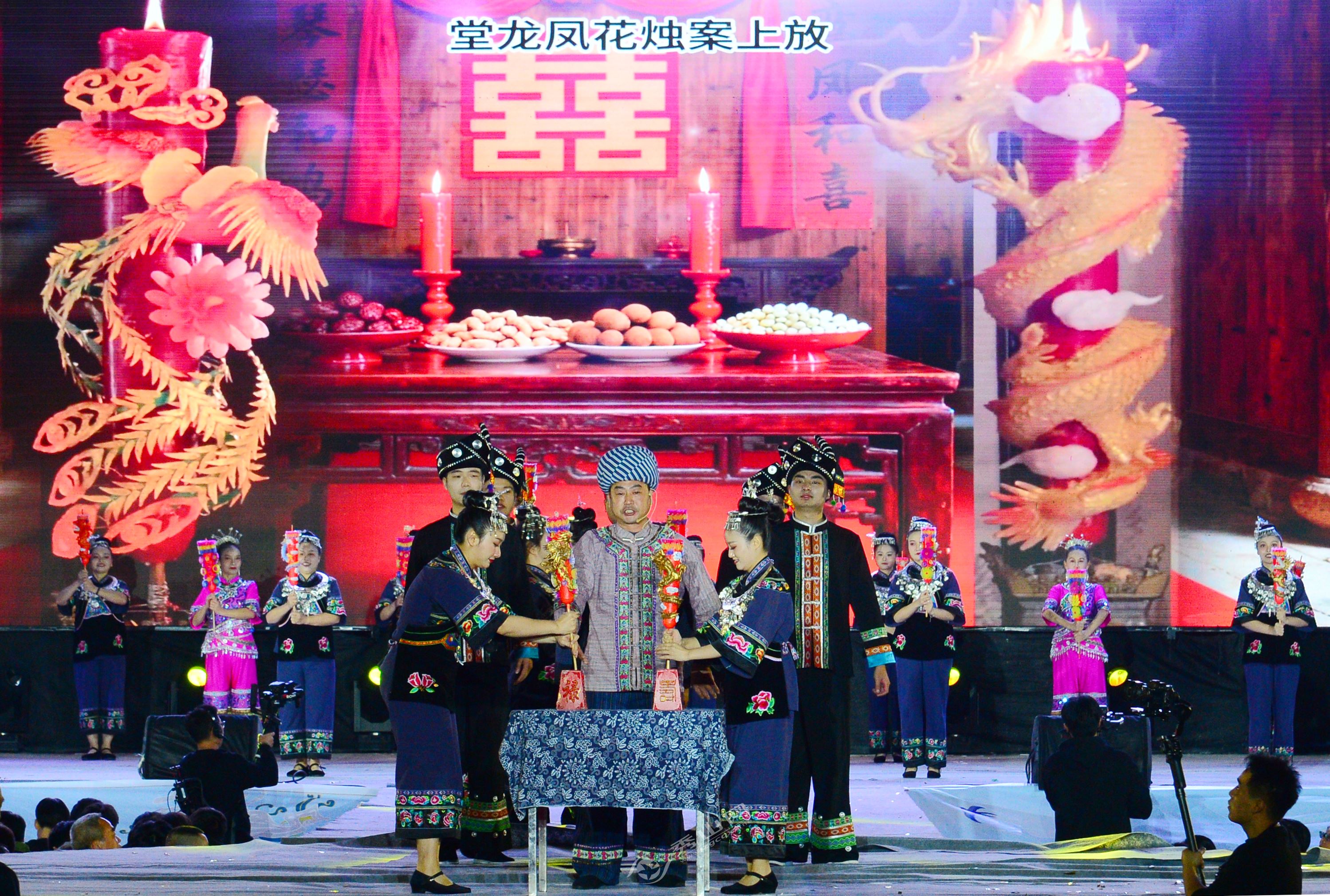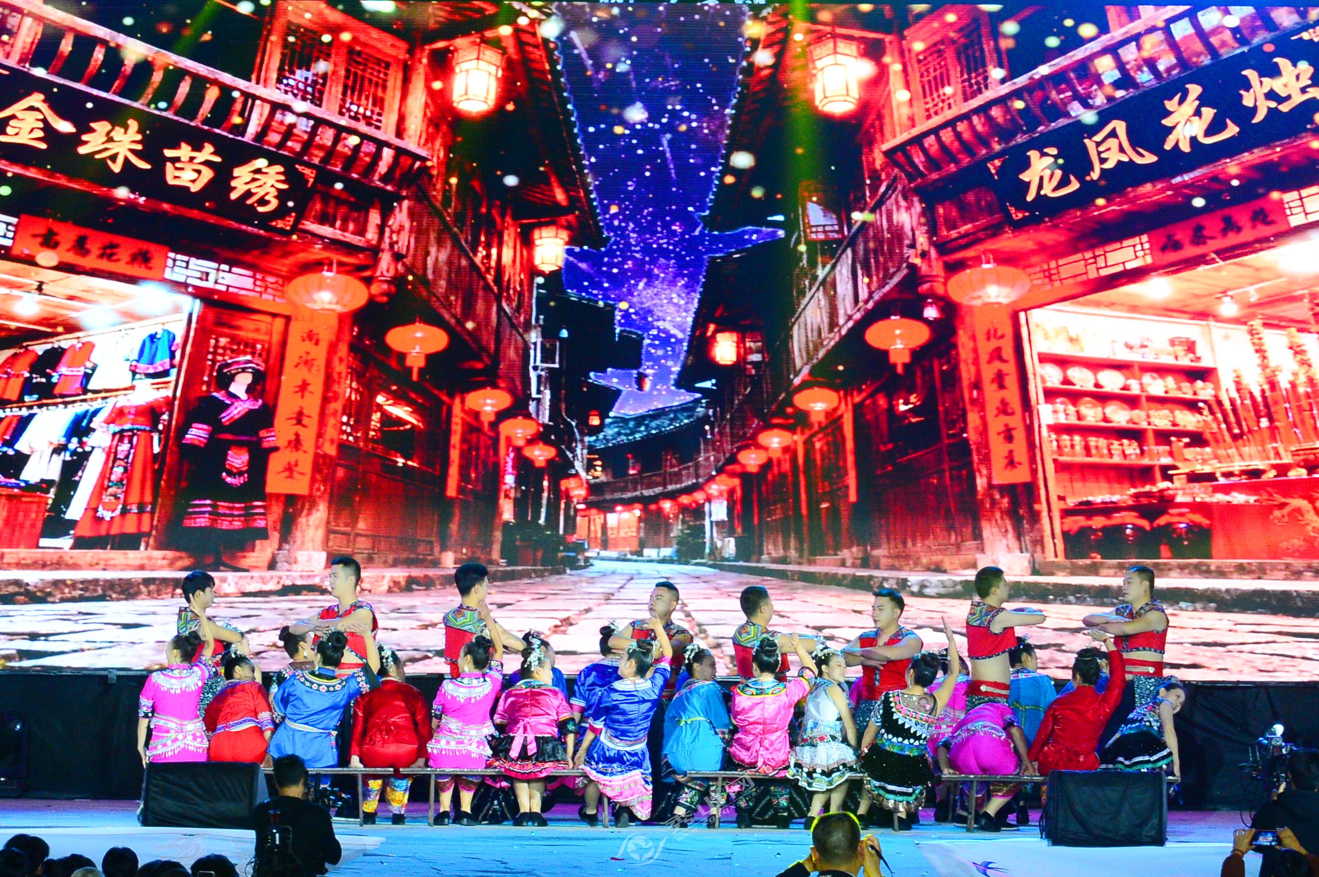 当晚七点,活动在充满乡土韵味的“秀”村歌环节中拉开帷幕:宋农镇带来的《挖土锣鼓歌》、梅江镇献上的《梅江长歌》,用质朴旋律勾勒出秀山乡村的生活图景;随后的“秀”村舞环节中,宋农镇的舞蹈《毛古斯(食姐)》动作古朴传神,还原民族生活场景;梅江镇带来的《长桌宴》欢快灵动,将苗族同胞待客的热情通过肢体语言尽情传递,民族文化特色鲜明;在“秀”村景与“秀”村货环节,快板《渔乡宋农》、情景剧《苗乡金珠》,既展示了乡村风貌,也推介了本地特色资源;最后的“秀”村趣环节,《舍巴神韵》《炸龙》等传统民俗节目接连登场,激昂的鼓点、热闹的表演将现场氛围推向高潮,让观众沉浸式感受秀山文化的魅力。