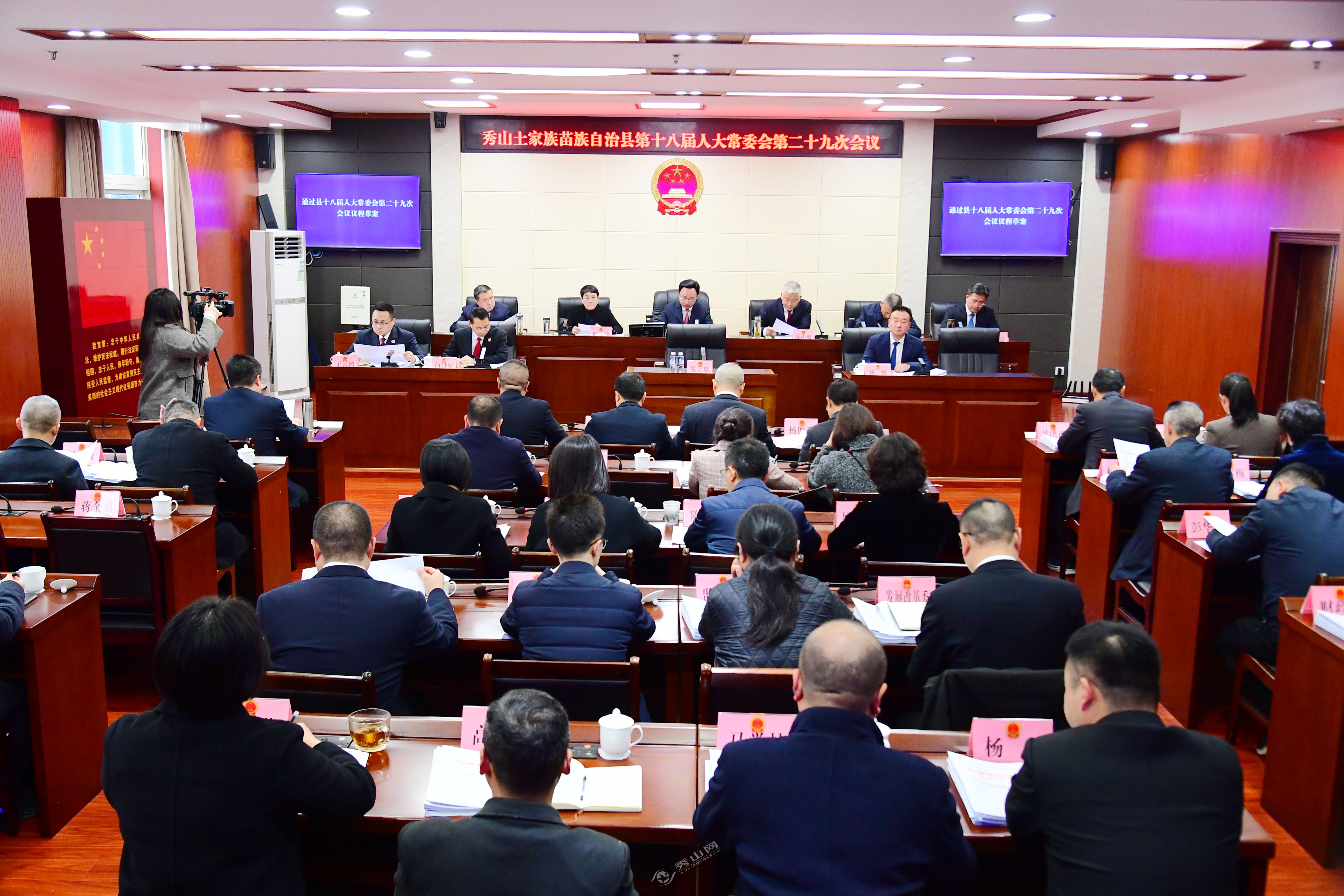 秀山网讯 12月23日,县十八届人大常委会召开第二十九次会议,听取和审议有关事项。县人大常委会主任任强主持会议,副主任陈山鹰、陈丽萍、向照勇、杨再庆、钟议及县十八届人大常委会组成人员出席会议。县政府副县长刘炼,县法院院长何洪波,县检察院检察长王云鹏,县监委、县政府办公室、县发展改革委、县司法局、县财政局等有关负责人列席会议。