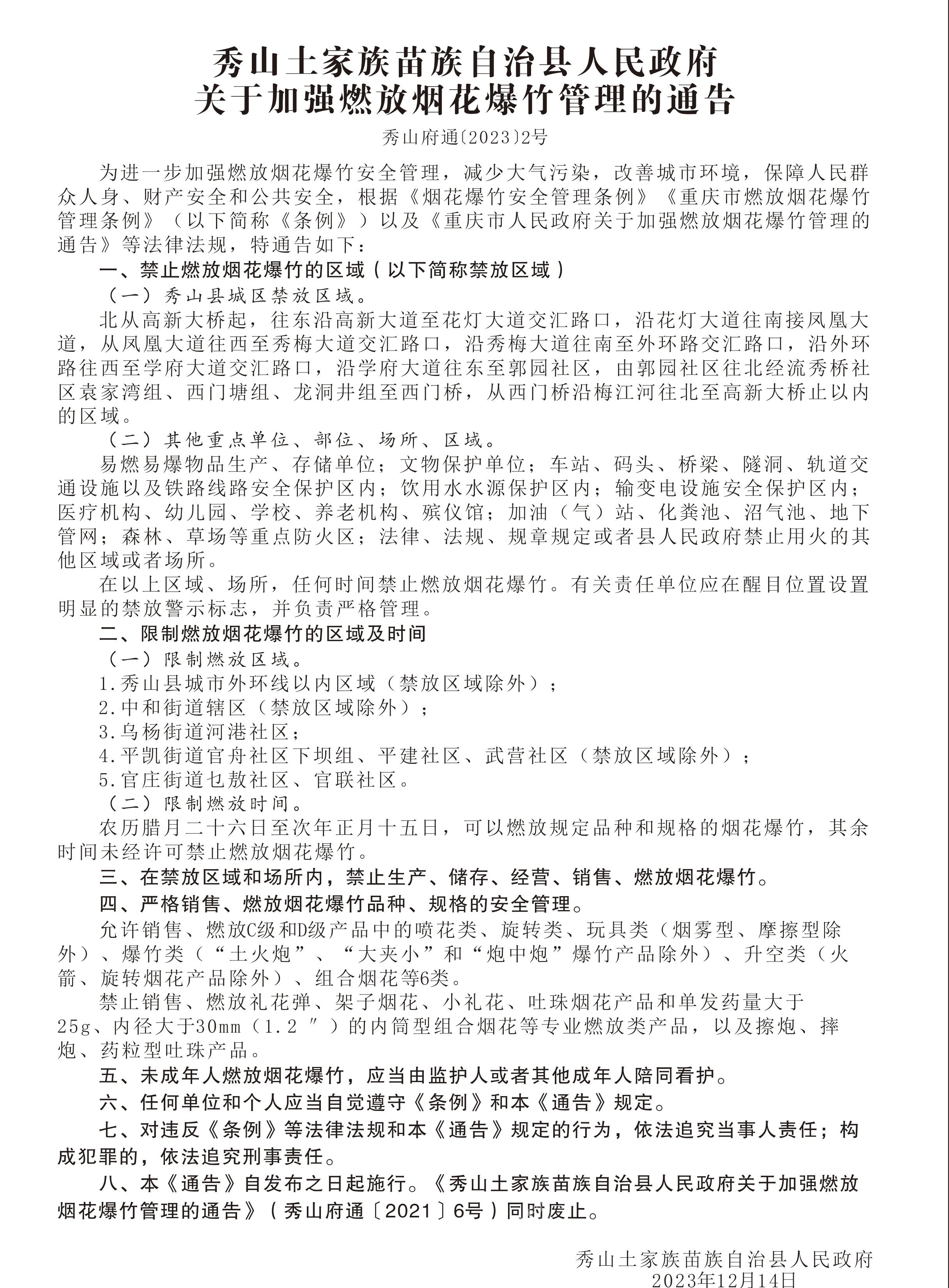 秀山土家族苗族自治县人民政府关于加强燃放烟花爆竹管理的通告