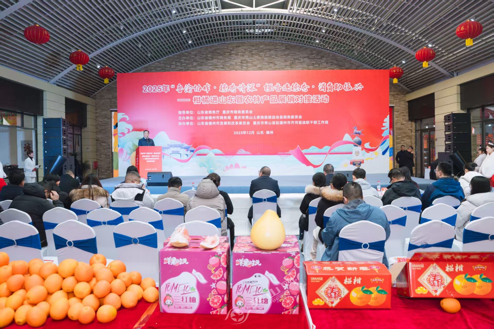 秀山网讯 12月24日,秀山县商务委员会携手山东省德州市商务局在山东德州奥莱广场举办了2025年“鲁渝协作·德秀情深”“橙香连德秀·消费助振兴”柑橘进山东暨农特产品展销对接活动。