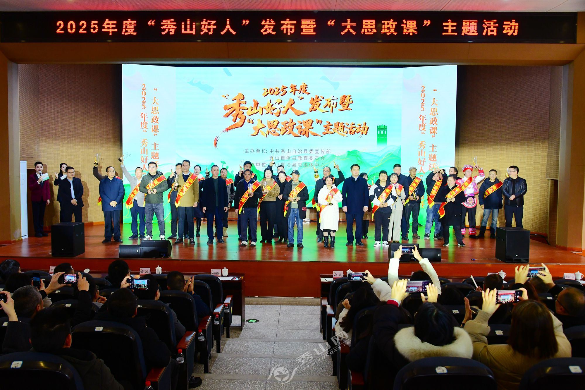 秀山网讯 12月25日,秀山县举行2025年度“秀山好人”发布暨“大思政课”主题活动。活动通过表彰先进典型、讲述感人故事,将榜样宣传与思想政治教育深度融合,为全县师生及各界代表上了一堂生动而深刻的“大思政课”。县委常委、宣传部部长高利出席活动并致辞。县人大常委会副主任陈丽萍,县政协副主席王天文参加活动。