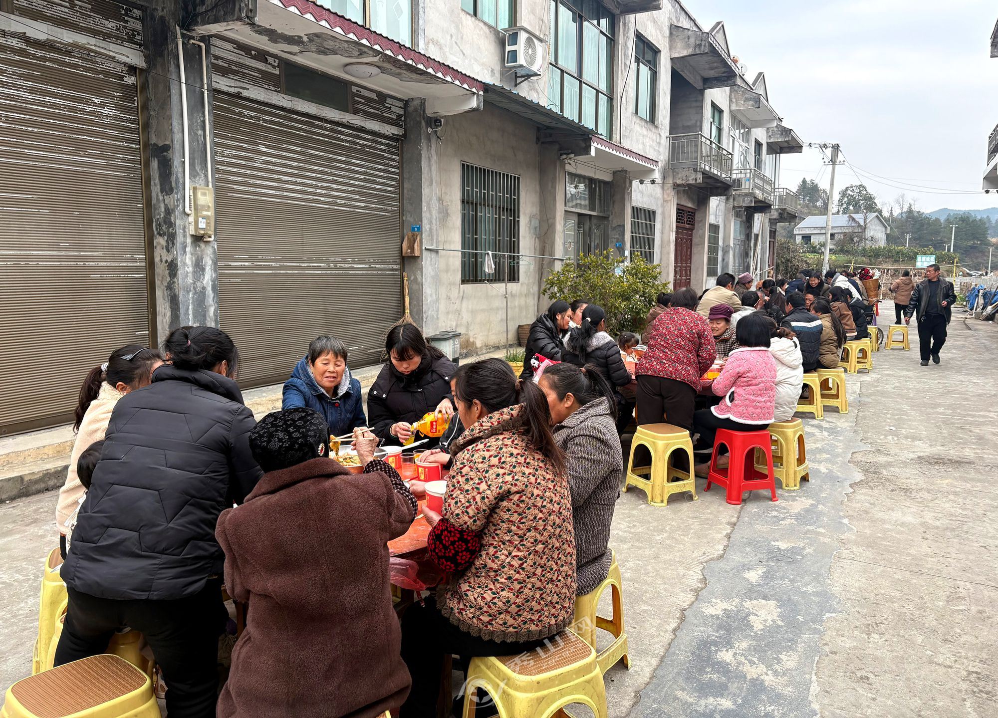 当天活动的亮点是“古韵中寨”长桌宴。下午3时许,承载着情谊的长桌在村中铺开,土家红烧肉等本地特色菜肴香气扑鼻。秀山中寨村与松桃马安村的干部群众围坐共餐,举杯互敬,现场氛围温馨和睦,生动体现了“邻里一家亲”的深厚情谊。