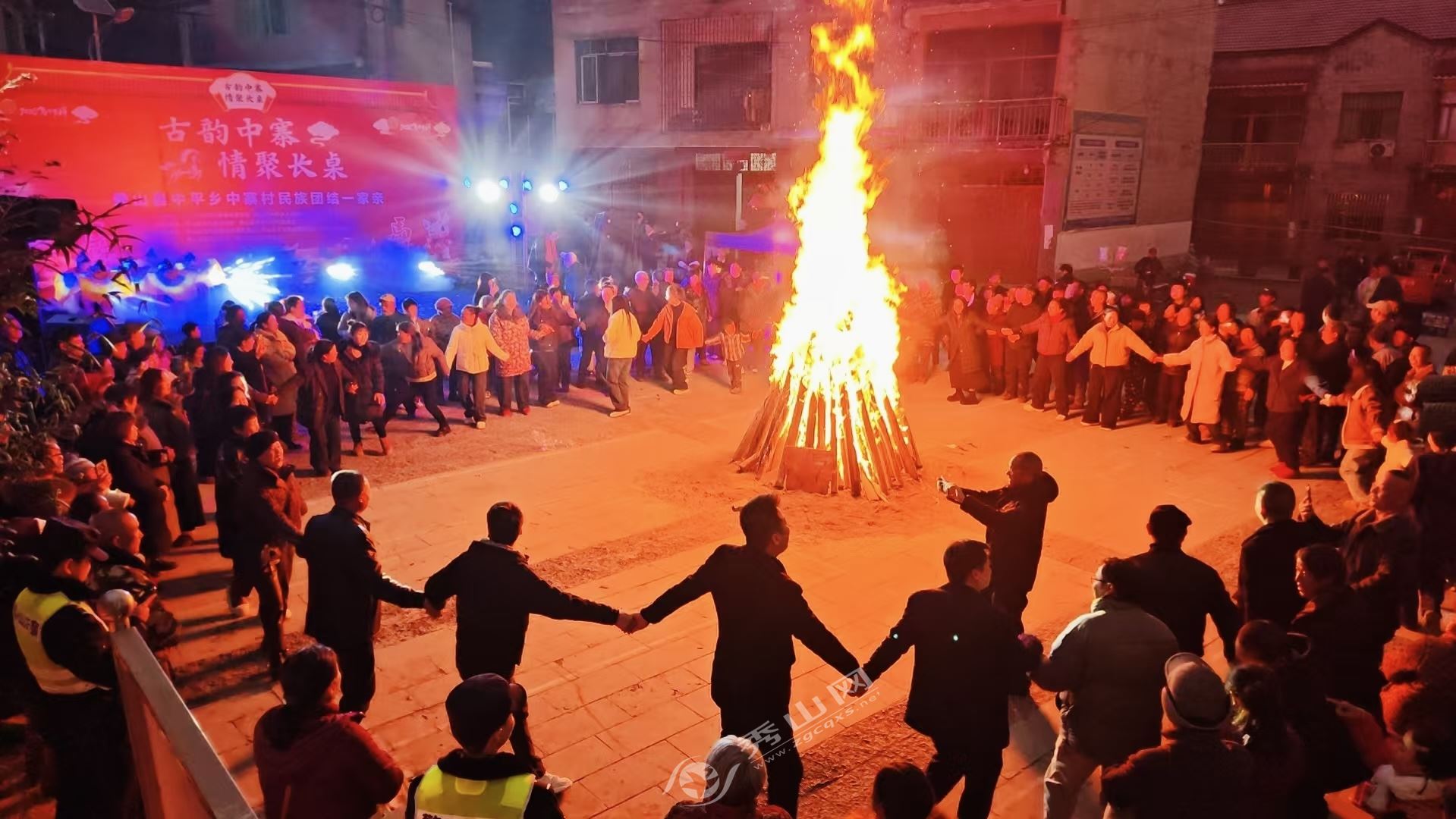 随着夜幕降临,篝火晚会将全天活动推向高潮。各族群众手挽手,围绕熊熊篝火跳起摆手舞等传统舞蹈,歌声、笑声与火光交织在一起,绘就出一幅民族团结、欢乐祥和的生动画卷。