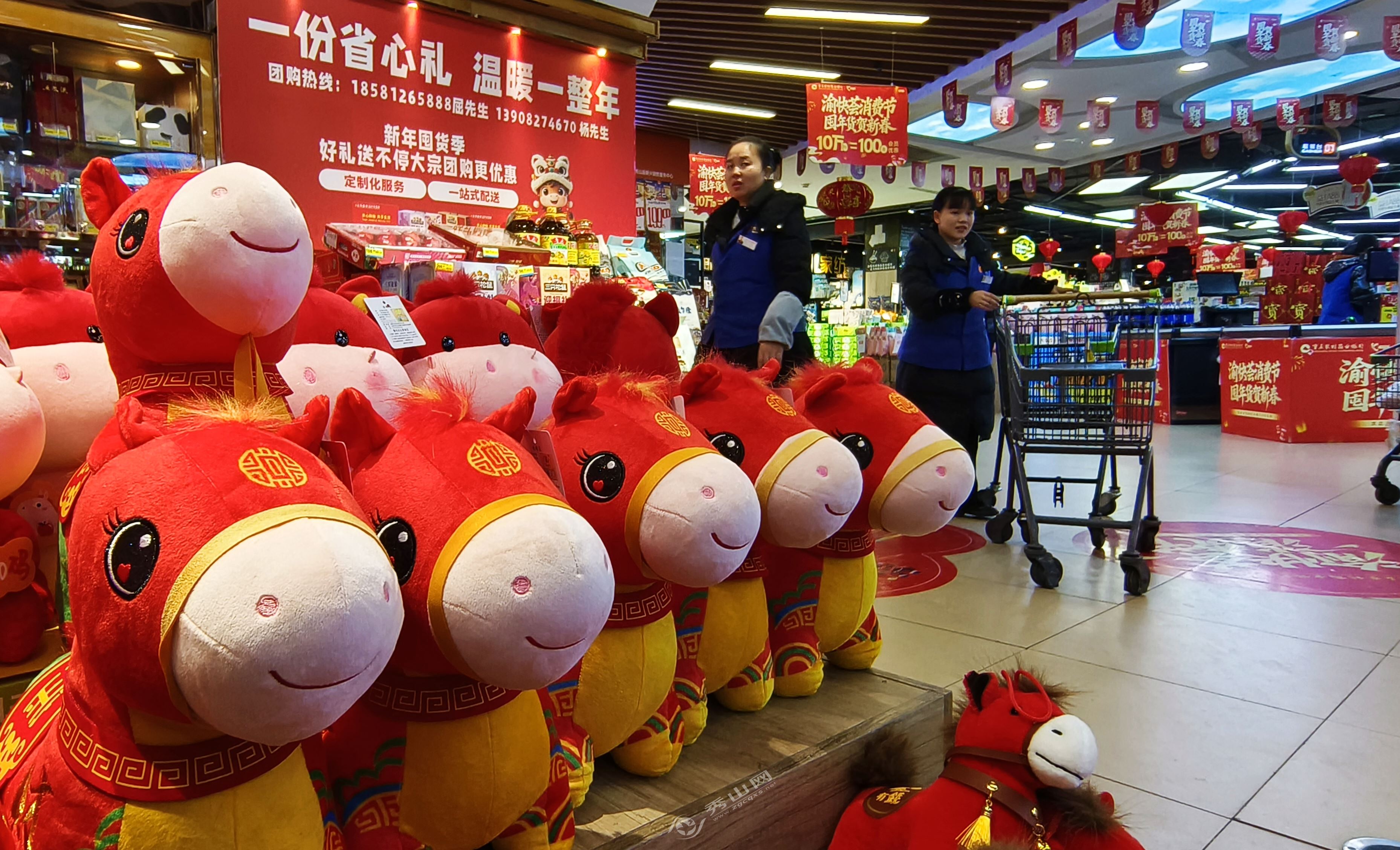 走进佳惠超市花灯广场店,只见店内人头攒动,市民们忙着挑选新鲜果蔬、特色点心。年货专区陈列整齐,坚果礼盒、传统糕点、时令水果、腊味熟食等一应俱全。大华超市中心广场店则被红灯笼、福字、中国结装点得温馨喜庆,除了粮油食品等基本年货外,春联、红包、马年主题玩偶等节庆饰品也备受欢迎。超市门口还设有配送专区,方便市民一站式采购年货。