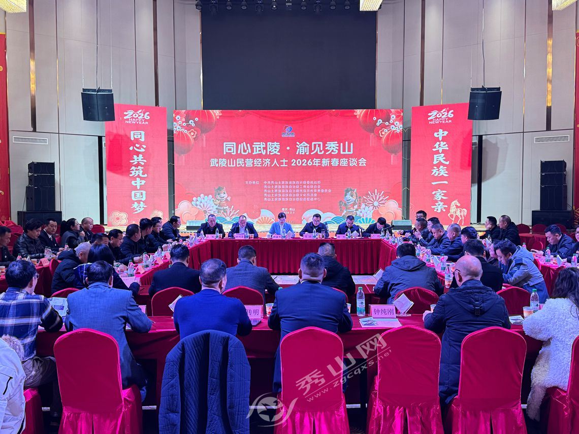秀山网讯 2月3日下午,以“同心武陵 渝见秀山”为主题的武陵山民营经济人士2026年新春座谈会在秀山武陵山大饭店召开。汇聚武陵山片区民营经济力量,共话发展新机遇,共谋合作新篇章。秀山县委常委、统战部部长林成芳出席会议并讲话,来自武陵山片区各区县的民营经济代表、相关部门负责人共50余人参加座谈。