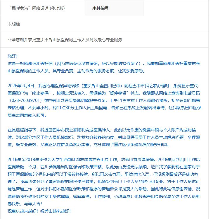 秀山网讯 近日,县医保局收到一封通过“民呼我为”平台的特殊来信。信中,参保群众闫女士对秀山医保工作人员耐心高效办理医保关系跨省转移接续业务致以诚挚谢意,字里行间充满了感动与认可。