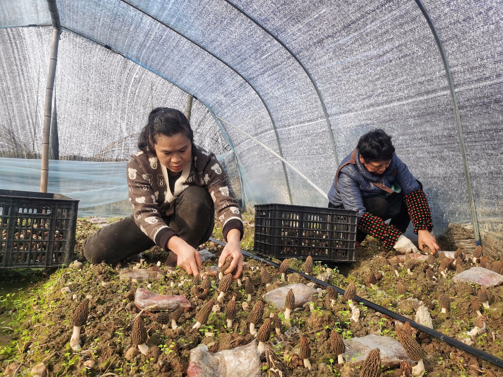 2月11日,记者走进龙凤坝镇的羊肚菌种植基地看到,一排排标准化大棚整齐排列。棚内温暖湿润,空气中弥漫着菌菇特有的清香。菌床上,一朵朵羊肚菌探出“脑袋”,菌盖纹理清晰,肉质厚实。农户们手持小刀,娴熟地捏住菌柄底部轻轻一划,便将成熟的羊肚菌采入筐中。