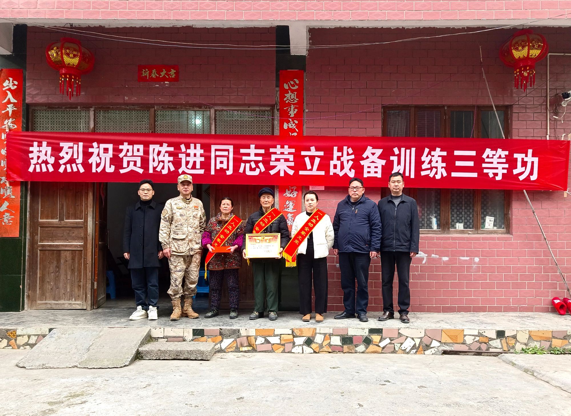 2月13日上午,慰问组一行来到现役军人陈进家中,为立功军人陈进亲属戴上绶带、送上立功喜报及慰问金,祝贺陈进在党的培养下,在部队的锤炼下取得的优异成绩。希望他们一如既往地鼓励孩子在保家卫国的神圣岗位上再接再厉,勇立新功,为家乡人民争光。