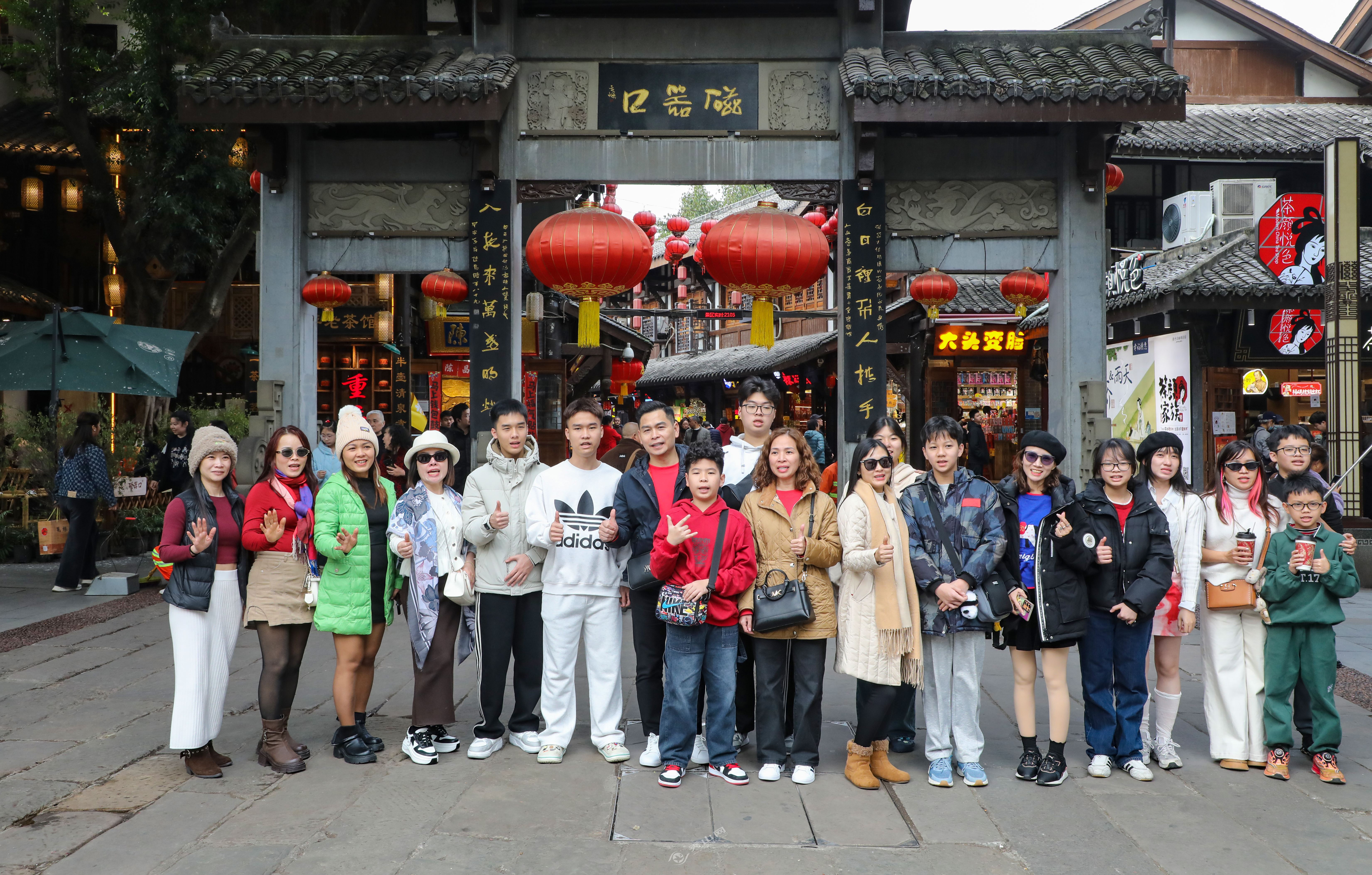 本报讯(记者 郭晋)2月16日春节假期第二天,沙坪坝区磁器口古镇游客络绎不绝,其中不乏来自海外的游客。当天,22名马来西亚游客和20名越南游客来到磁器口古镇,大家在此尽享特色美食,畅游山城风光,深度感受巴山渝水的独特韵味。