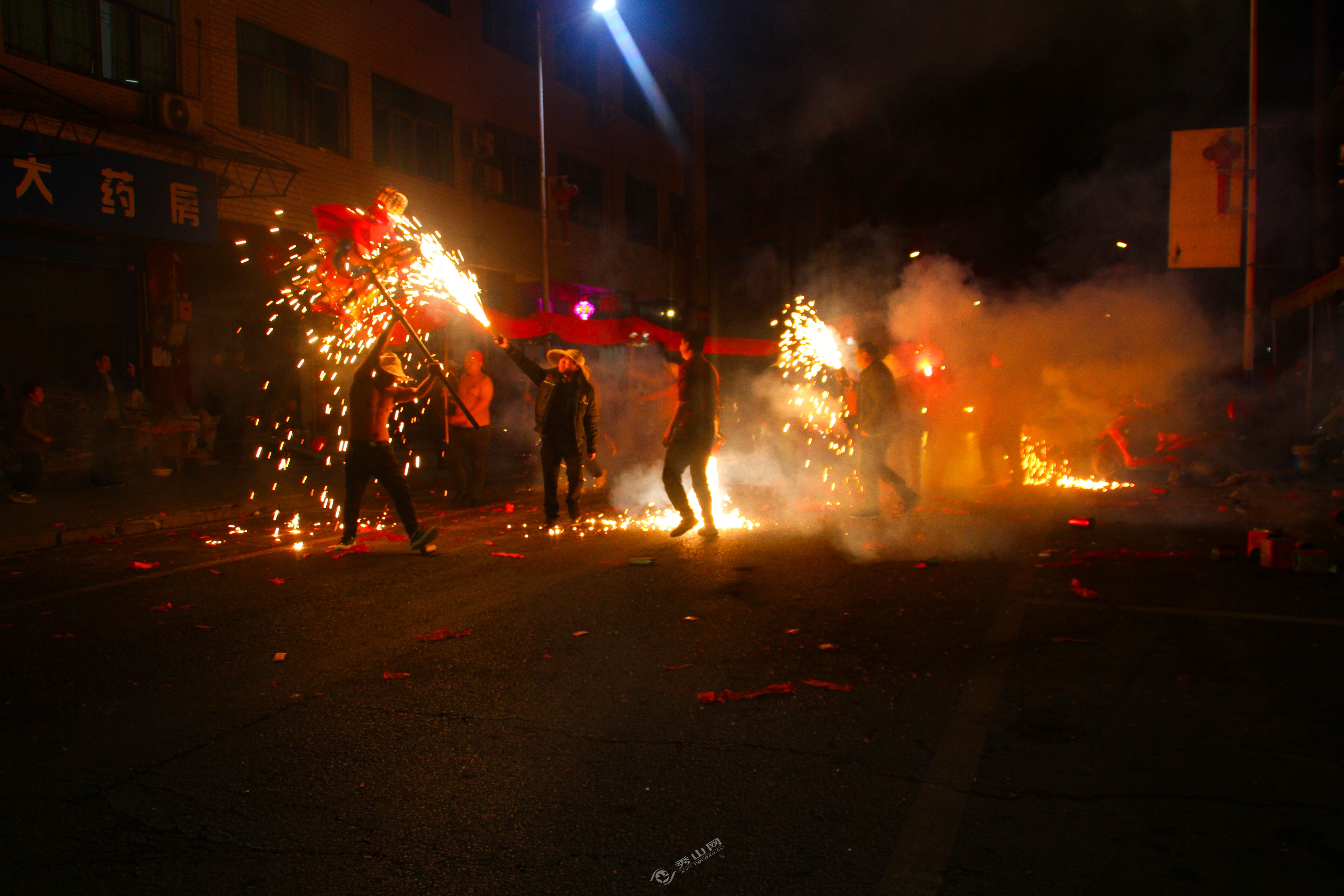 当日傍晚,暮色初临,4条身披彩布的“火龙”从集镇各处集结出发,舞龙者赤膊上阵,头戴防护帽,手持龙竿,在锣鼓声中灵活穿梭。随着第一串鞭炮被点燃,炸龙活动正式拉开帷幕。沿街群众纷纷点燃早已准备好的鞭炮,有的用竹竿高高挑起,有的直接手持,对准龙身、龙头尽情 “轰炸”。