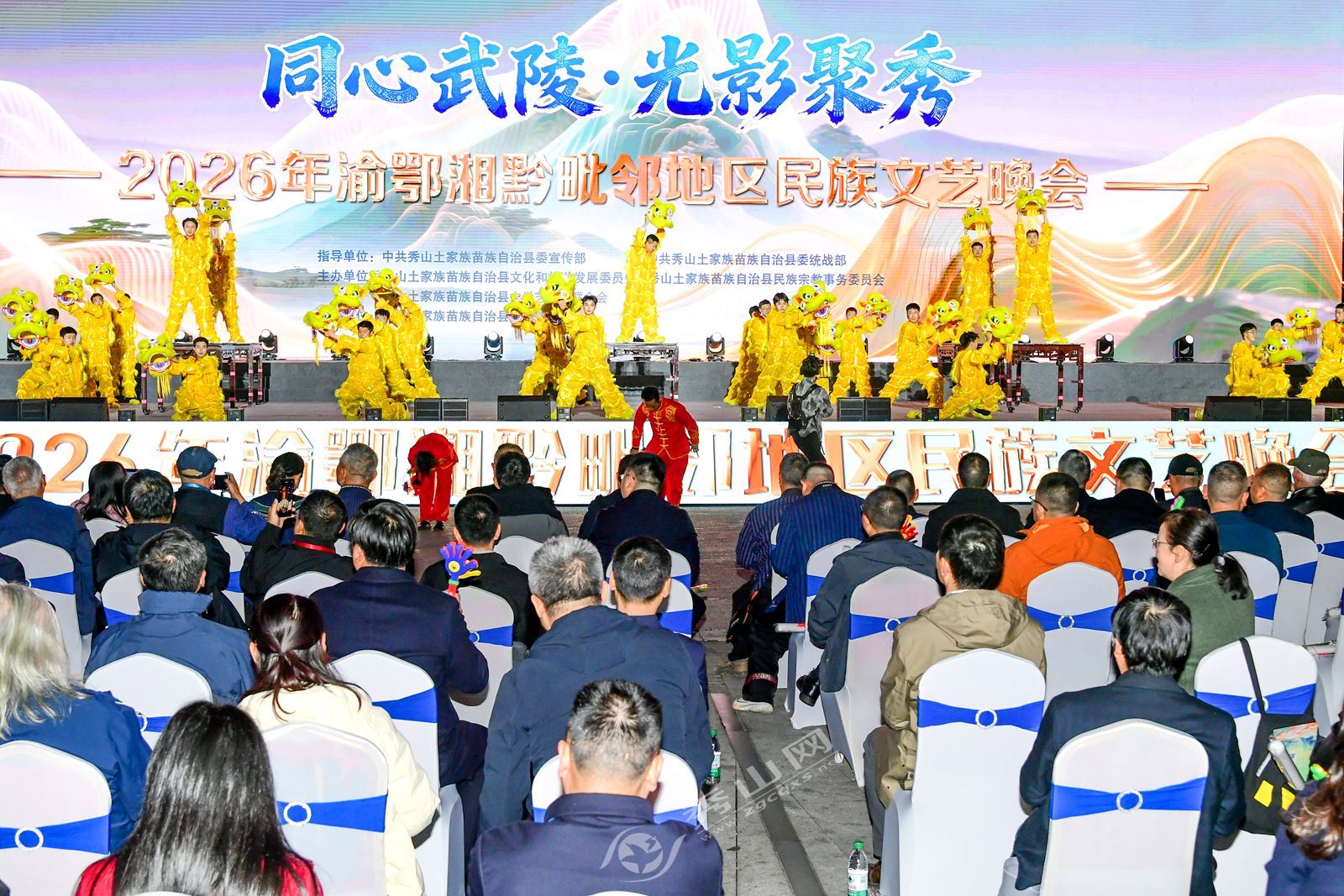 摄影展启动后,“同心武陵·光影聚秀”暨贯彻总体国家安全观·护航“十五五”新征程民族文艺晚会温情开演。晚会分为“载歌载舞乡约边城”“秀山秀水武陵遗韵”“同心同梦共谱新篇”三个篇章,渝鄂湘黔毗邻地区文艺团体联袂献艺,《金狮闹春》《长桌宴》《烛影摇红》《太阳出来喜洋洋》等14个特色节目轮番登场,融合苗族歌舞、秀山花灯、傩戏、非遗小调等多元文化元素,生动展现武陵山区民族风情、非遗魅力与奋进风貌,现场掌声不断、暖意融融。