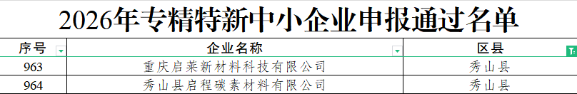 秀山此次入选的企业为重庆启莱新材料科技有限公司、秀山县启程碳素材料有限公司,涉及新材料、新能源领域。截至目前,全县有市级专精特新企业超41家,覆盖新材料、食品等重点产业领域,充分展现了秀山在推动产业转型升级、培育优质中小企业方面的显著成效。