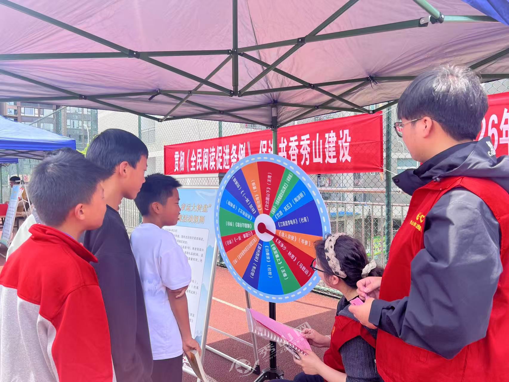 为激发中学生的阅读兴趣,本次活动创新服务形式,打造趣味阅读互动场景。在趣味答题专区,志愿者们围绕文学知识、本土文化、安全常识等内容设计题库,同学们踊跃参与答题,赢取阅读积分券;幸运大转盘前更是排起长队,指针转动间,水杯、计算器、笔记本等奖品接连送出,现场欢笑声、喝彩声此起彼伏;“护苗·绿书签行动”签字墙前,众多学生驻足留言,表达对绿色阅读、文明阅读的认同。志愿者们全程引导、耐心讲解,让同学们在轻松愉悦的氛围中感受到阅读的乐趣。