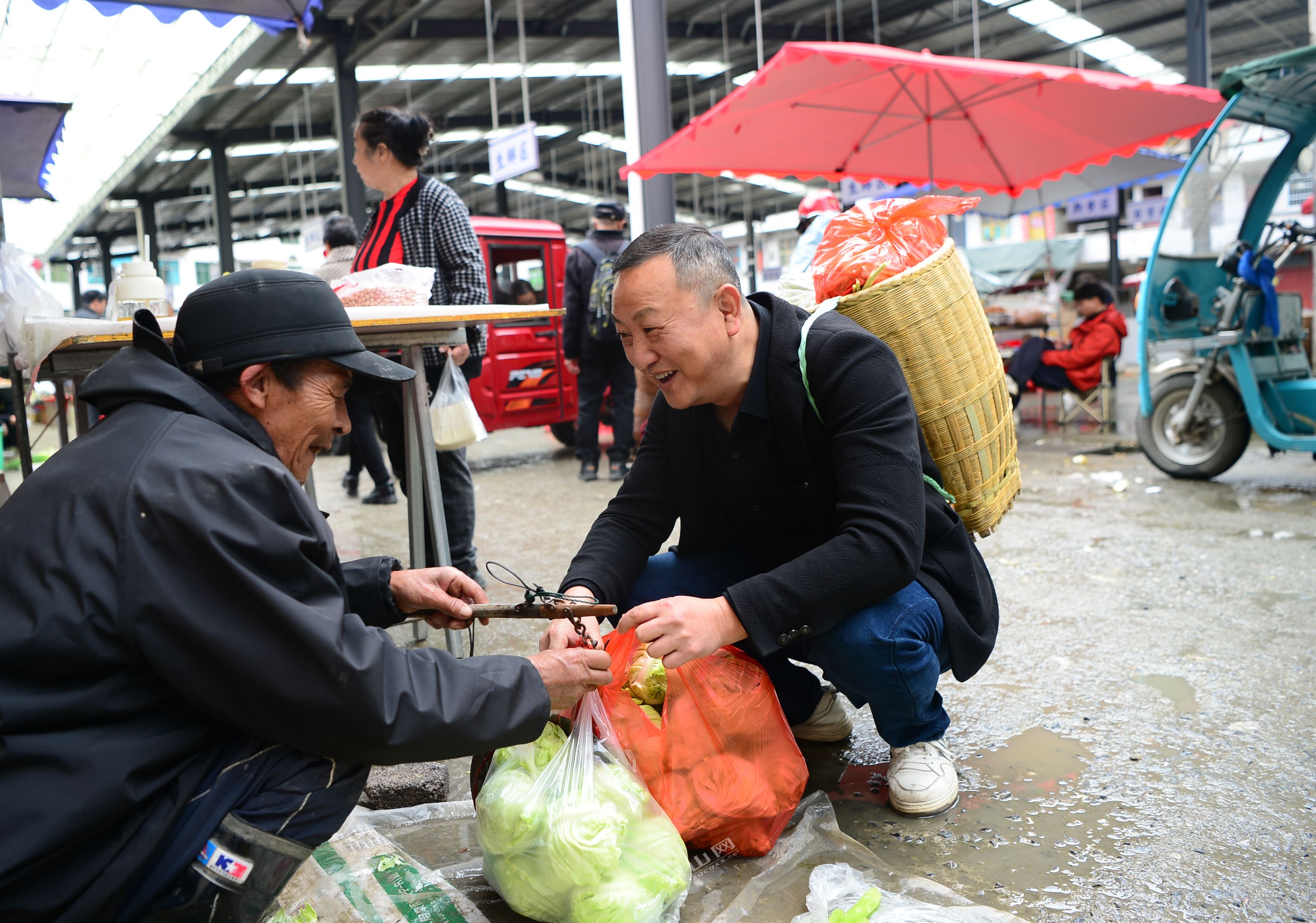 “对头!来看看哪些老人的菜卖不脱,我全部打包买走,他们好早点回家撒。”