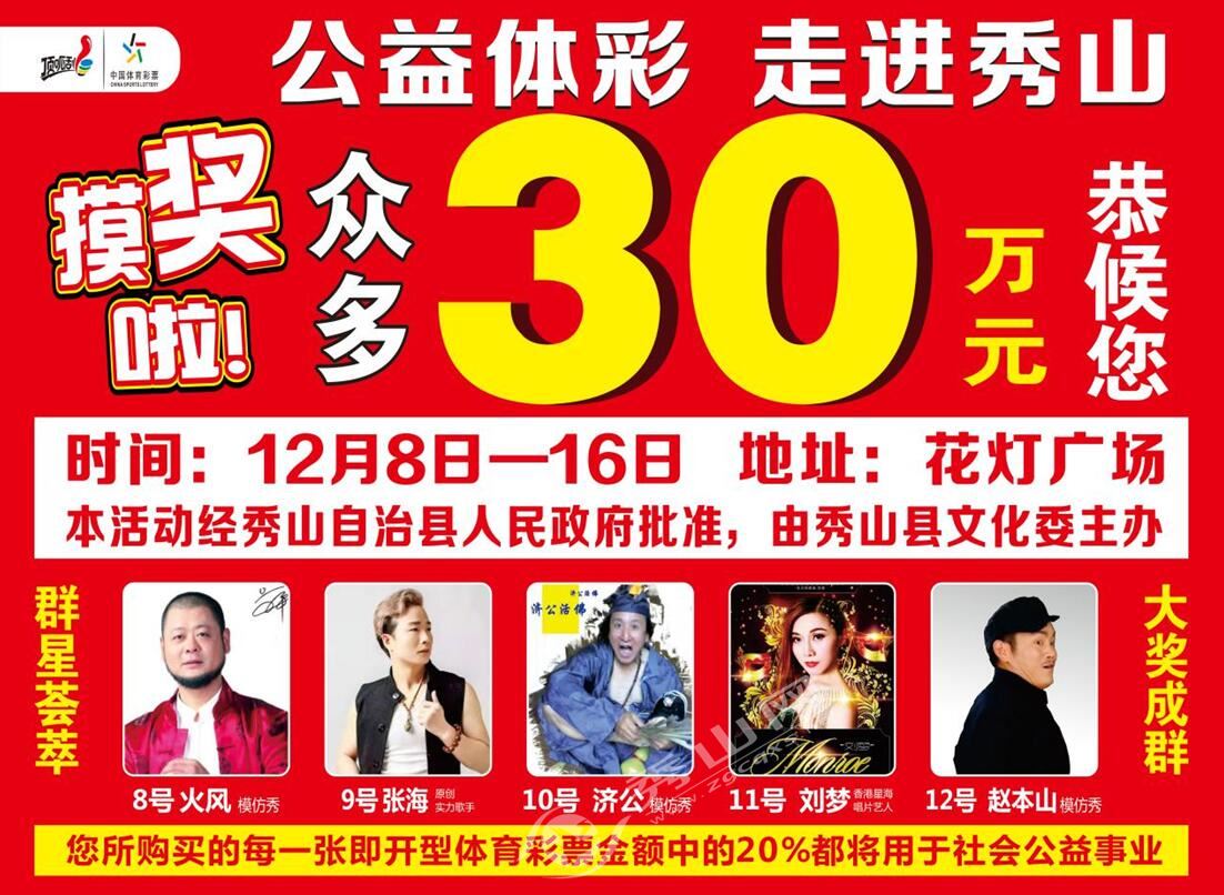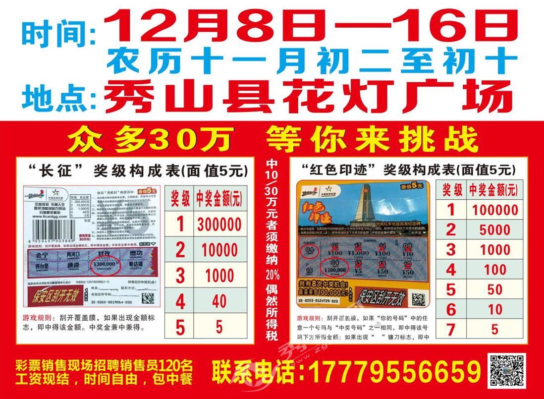 秀山网讯 “体彩公益行——走进秀山” 即开型体育彩票销售活动于12月8日起在花灯广场火爆开展,30万大奖等您中,精美礼品等您拿!现场将有精彩演义节目助兴!5元的付出,30万的好运!