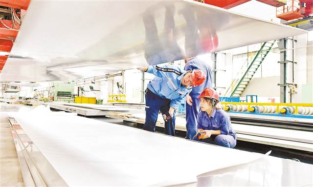 西南铝工作人员在生产线上检查即将出口乌克兰的铝材产品。