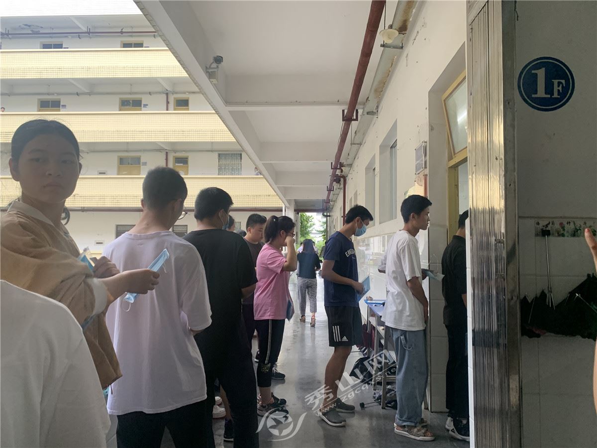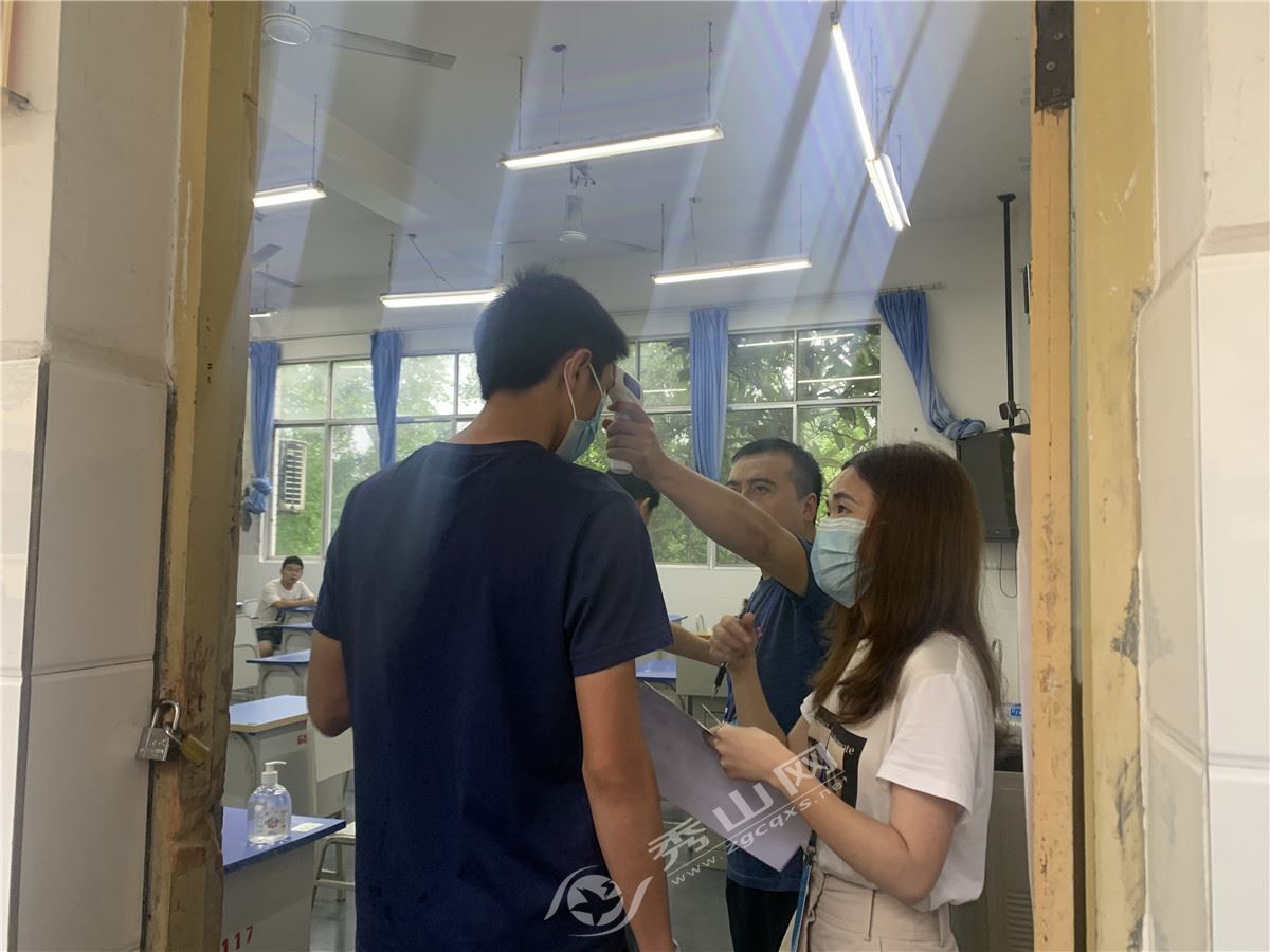 在高级中学考点,考生们按照规定通道和指引,有序进入校园。与以往不同的是,考生们进考场多了一道工作——测体温,有序等待入场。