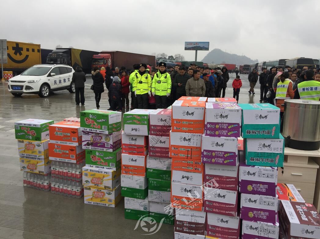 秀山网讯 1月27、28日因湖南、贵州境内冰雪天气,路面结冰严重,秀松高速、包茂高速实行交通管制,导致我县秀松高速梅江站、包茂高速洪安站大量车辆和旅客滞留,受困群众生活困难,县委、县政府领导及时做出批示,县民政局第一时间紧急调拨了3000桶方便面、100件矿泉水及面包,饼干等生活物品及时赶到秀松高速梅江站、包茂高速洪安站,联合高速路工作人员设立临时救助点,24小时供应开水,对受困旅客发放了方便面、矿泉水等生活物品, 确保滞留人员基本生活得以保障,截止目前已有2000多名滞留人员得到救助。