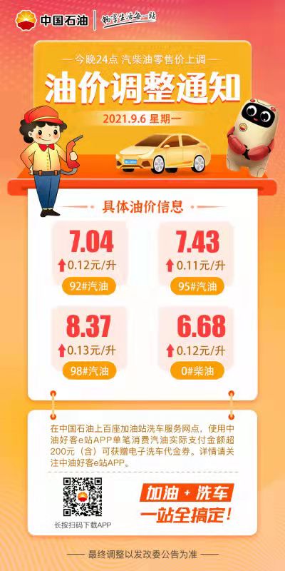 秀山网讯 9月6日24时,国内成品油零售限价上调窗口开启,全国各地加油站将统一上调零售价格。