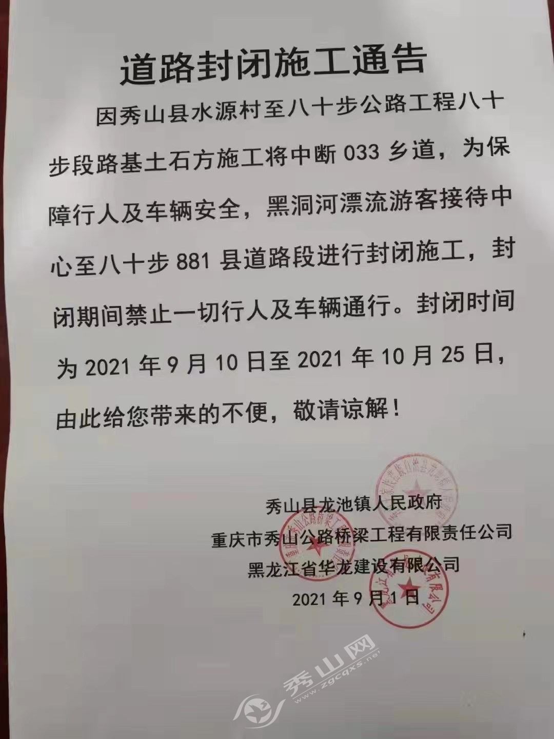 秀山网讯 记者从龙池镇人民政府了解到,因龙池镇水源村至八十步公路工程八十步段路基土石方施工将中断033乡道,为保障行人及车辆安全,黑洞河漂流游客接待中心至八十步881县道路段进行封闭施工,封闭期间禁止一切行人及车辆通行。封闭时间为2021年9月10日至2021年10月25日,有需自驾前往川河盖旅游区的游客请绕道而行。