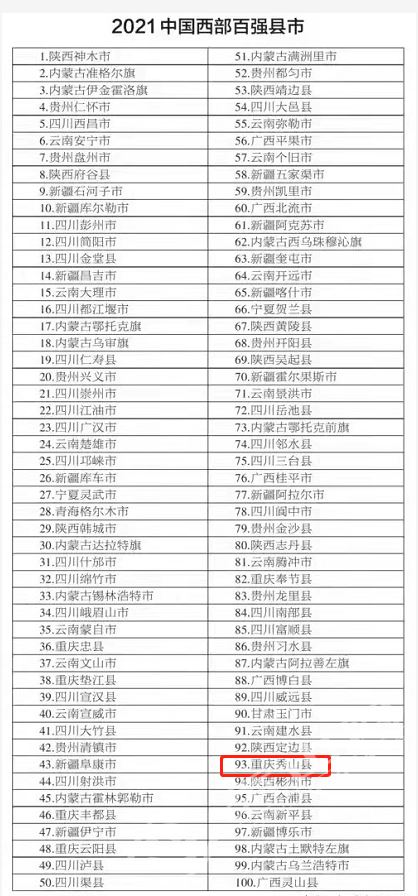 秀山网讯 9月23日,竞争力智库、中国经济导报社、北京中新城市规划设计研究院等机构联合发布《中国西部地区县域发展监测报告2021》,揭晓“2021中国西部百强县市”名单,秀山县再度上榜,较之去年上升5个名次。
