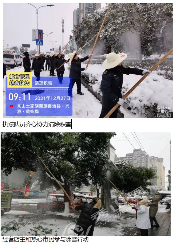 行动中,“城管人”在高空作业车、雾炮车、高炮车的辅助下,用特制扫帚、竹棍等工具清除树上积雪,小雪大雪纷纷落下。“大城众管”得到实质体现,部分过往市民、经营店主也积极参与到行动中来,这场“人工降雪”成为城市一道靓丽的风景线。