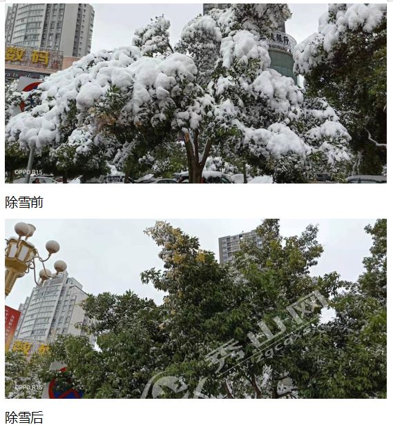 通过集中行动,行政中心、花灯广场、渝秀大道、黄杨大道等区域行道树完成清理。接下来该局将集中力量开展积雪、断枝清理工作,让城市尽快恢复正常的生产生活秩序。