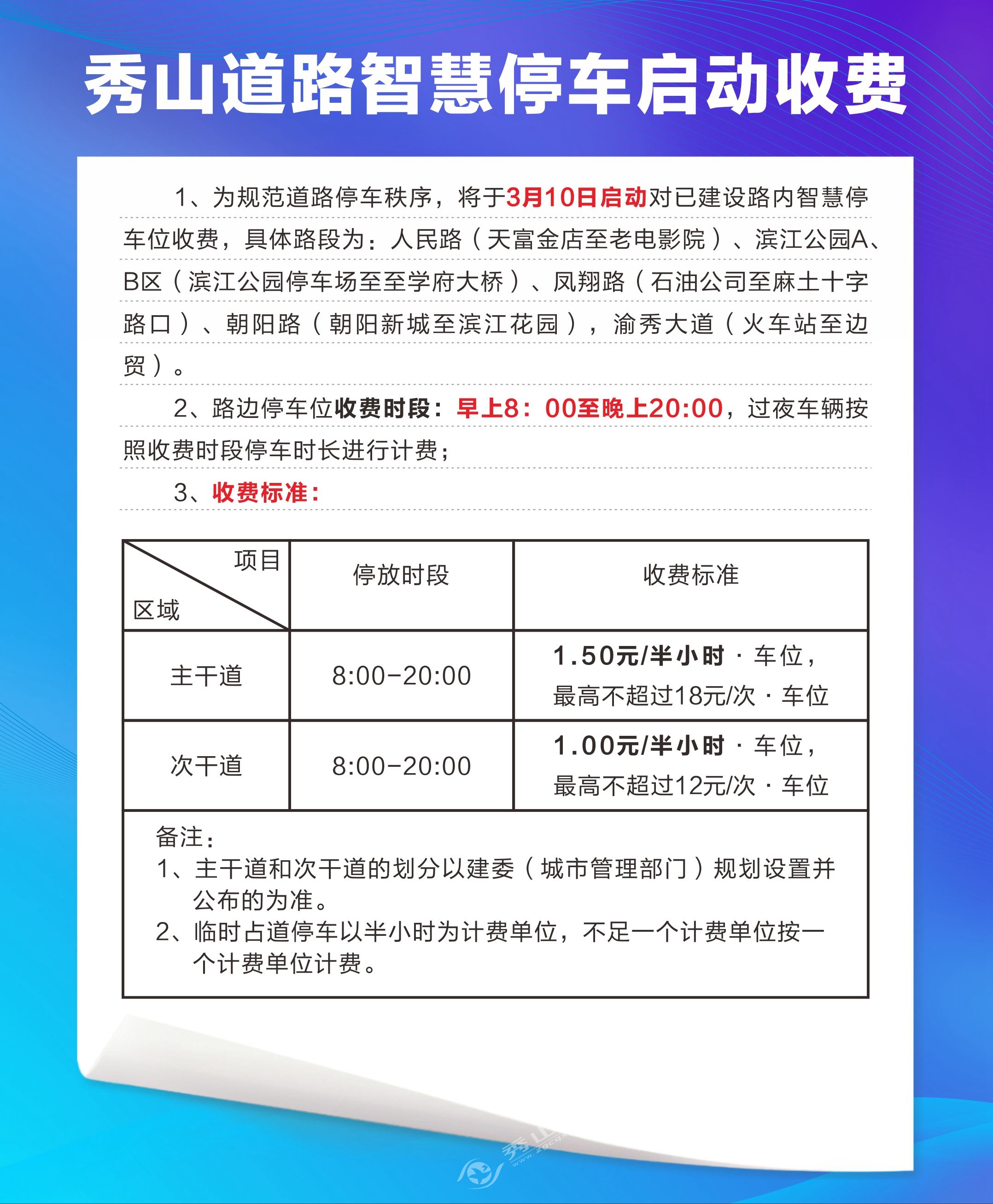 秀山网讯 为全面提升城市品质,规范道路停车秩序,缓解我县停车难问题,3月10日起,我县将对城区已建设路内智慧停车位纳入收费管理。