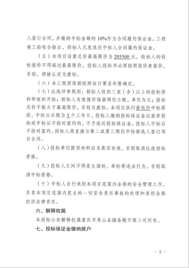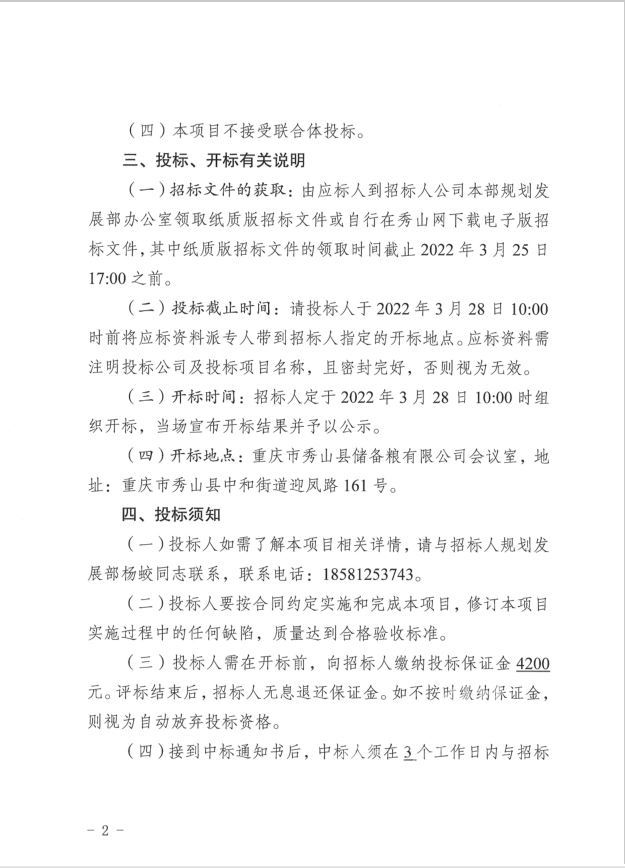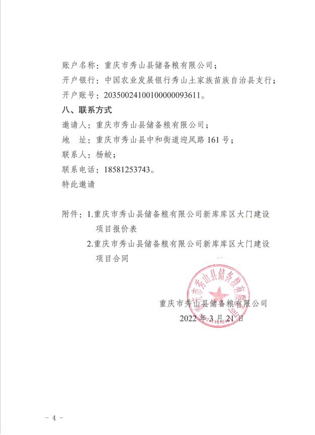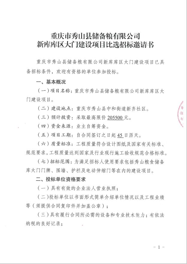重庆市秀山县储备粮有限公司新库库区大门建设项目比选招标邀请书