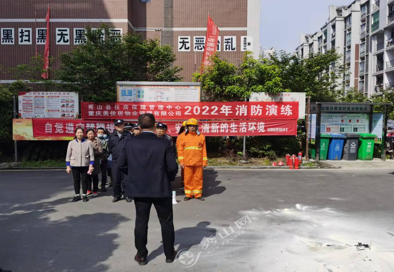 秀山网讯 4月6日,县住房城乡建委会同中和街道办事处、县消防救援大队和公租房物业服务企业,在裕康家园公租房小区开展消防应急演练。