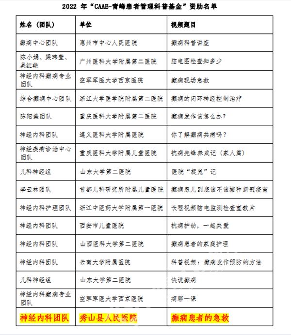 秀山网讯 日前,2022年“CAAE-青峰患者管理科普基金”资助名单揭晓,秀山县人民医院神经内科团队榜上有名。