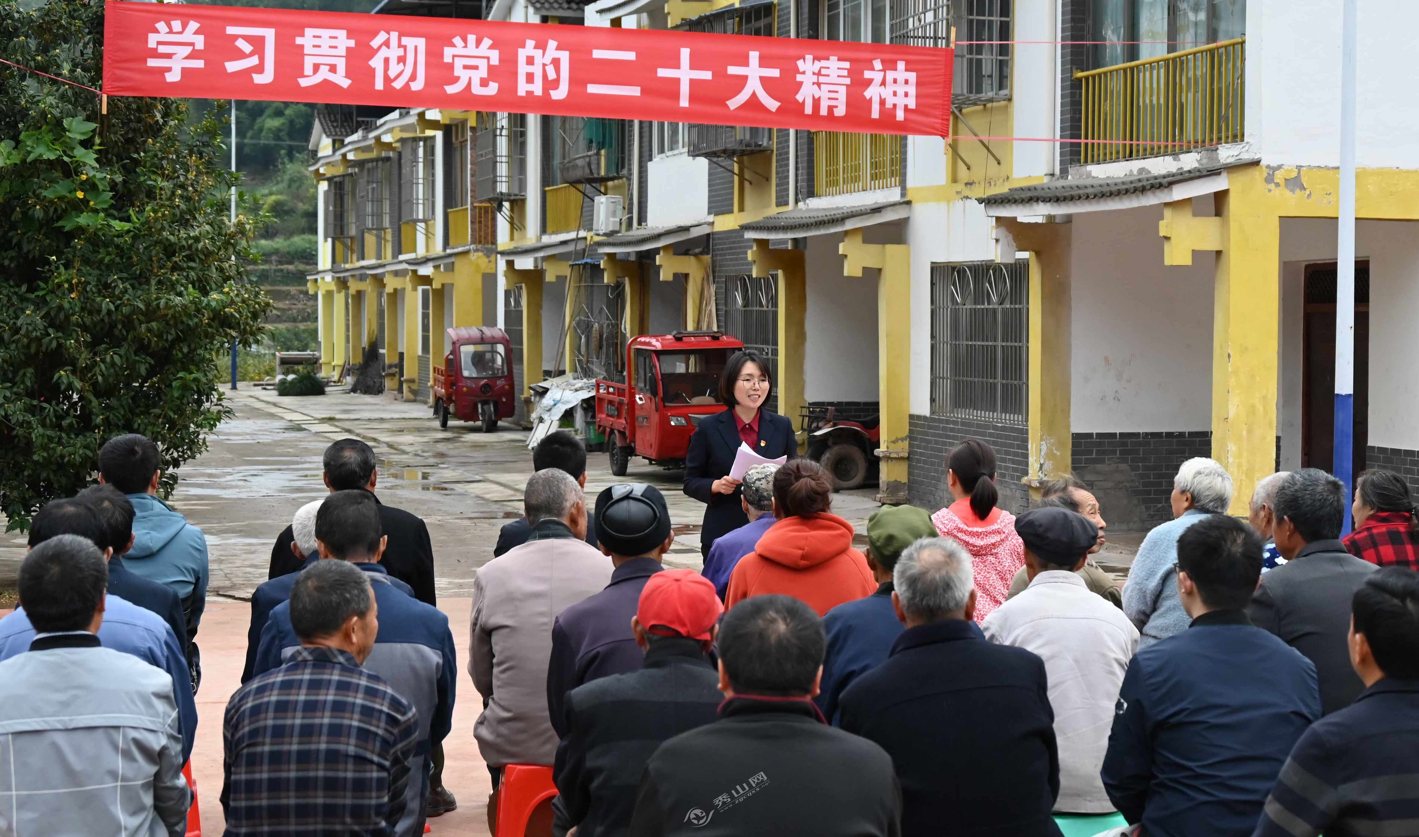▲10月25日,万州区长滩镇茶坪村,余小平向村民宣讲党的二十大精神。通讯员 张倩 摄