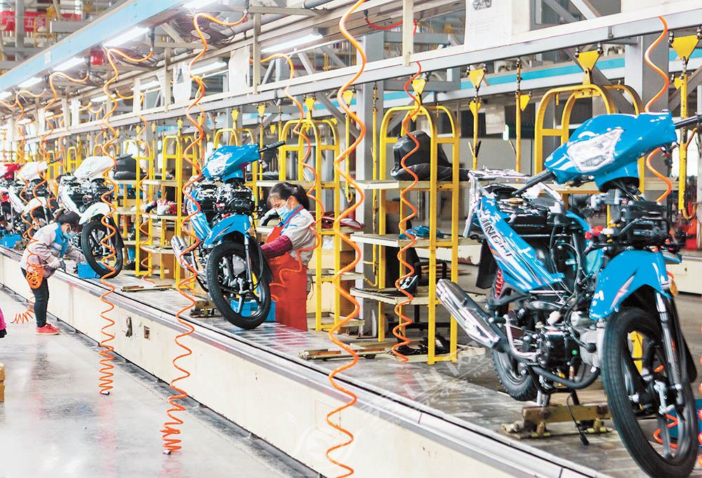 11月17日,大足高新区重庆大隆宇丰摩托车制造有限公司一手抓防疫、一手抓生产,工人正在在组装摩托车。特约摄影 瞿波/视觉重庆